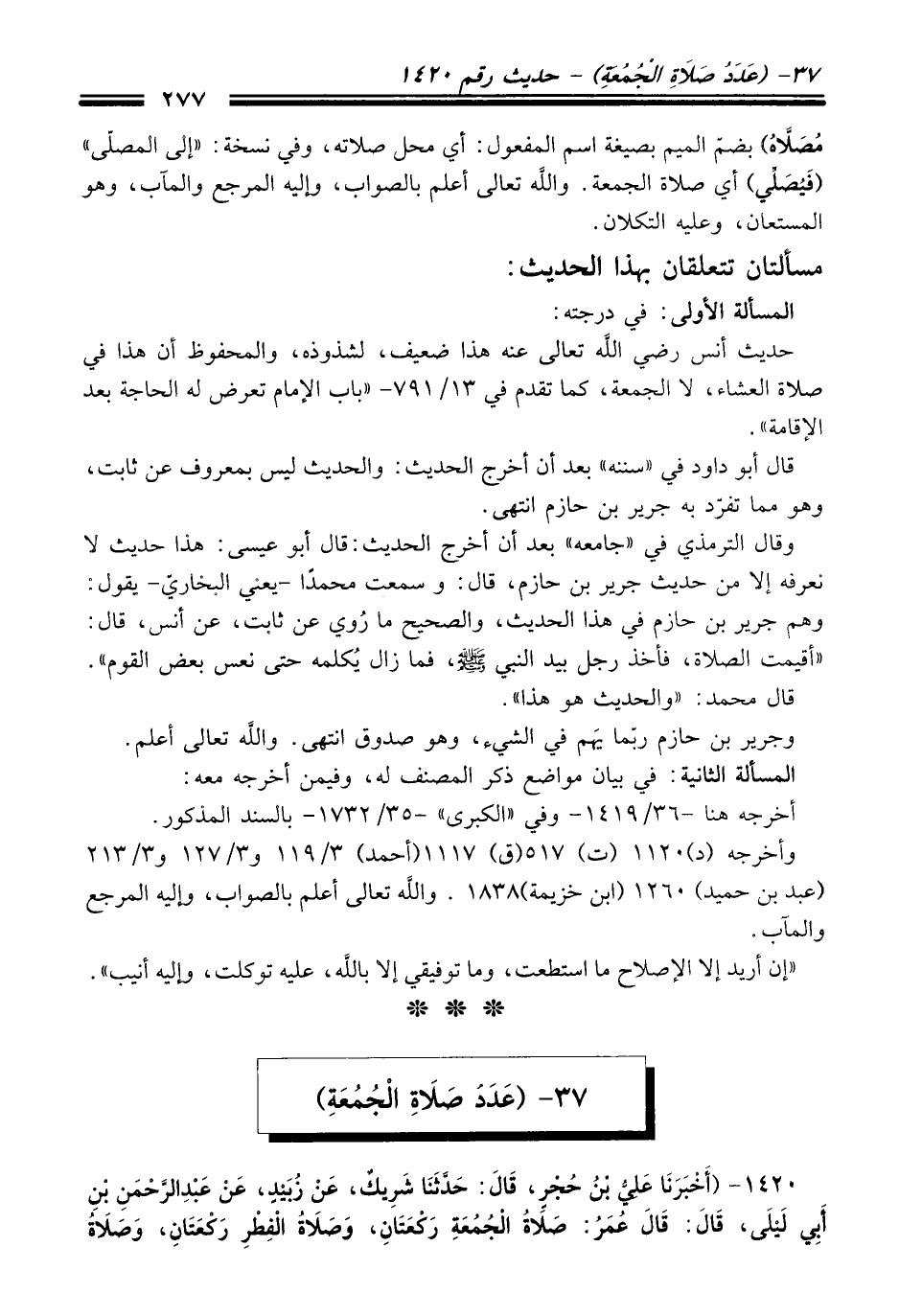 وقال الترمذي في "جامعه" بعد أن أخرج الحديث: قال أبو عيسى: هذا حديث لا نعرفه إلا من حديث جرير بن حازم، قال: وسمعت محمداً -يعني البخاريّ- يقول: وهم جرير بن حازم في هذا الحديث، والصحيح ما رُوي عن ثابت، عن أنس، قال: "أقيمت الصلاة، فأخذ رجل بيد النبي -صلى الله عليه وسلم-، فما زال يُكلمه حتى نعس بعض القوم".
