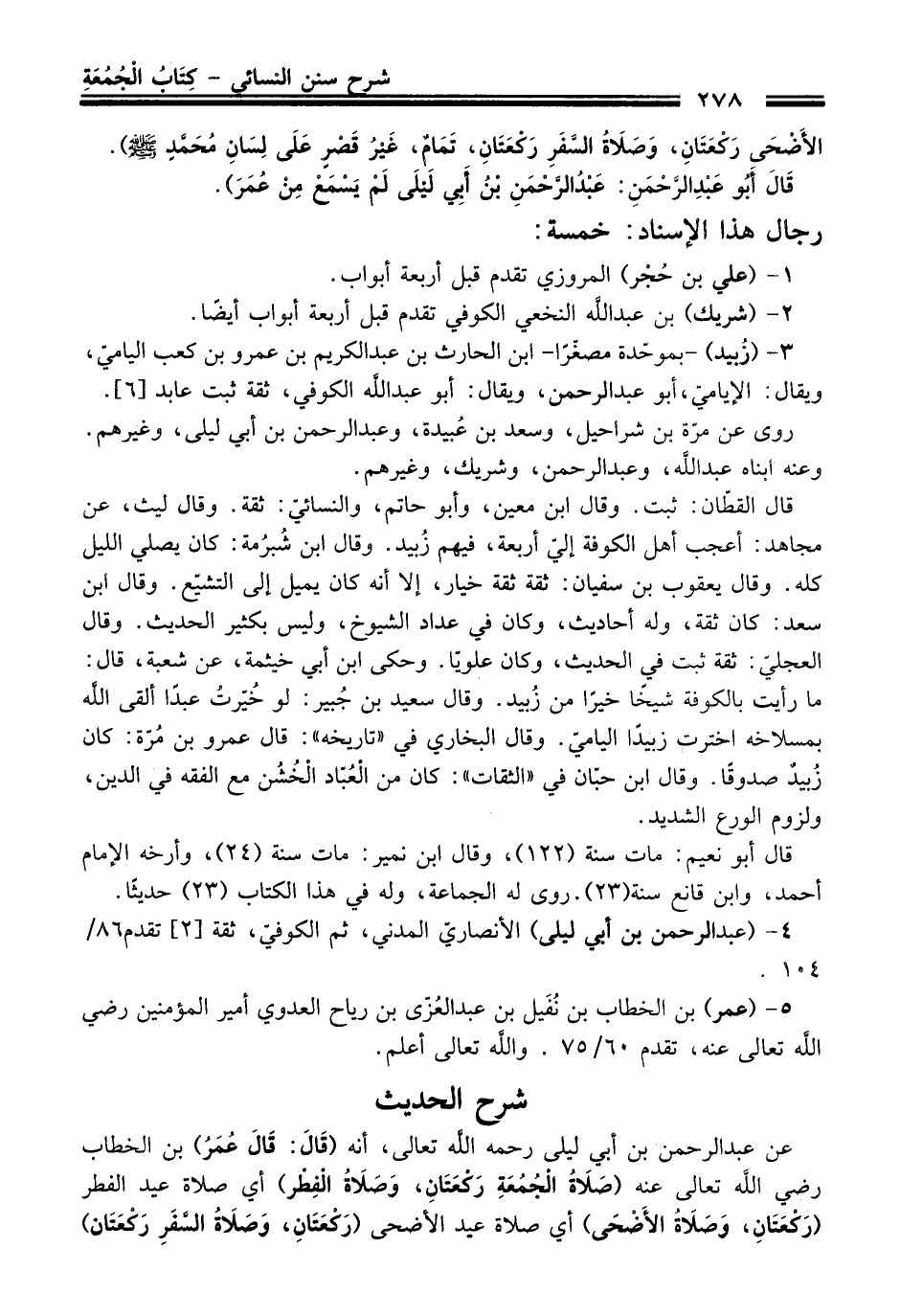 عن عبد الرحمن بن أبي ليلى رحمه الله تعالى، أنه (قَالَ: قَالَ عُمَرُ) بن الخطاب رضي الله تعالى عنه (صَلَاةُ الْجُمُعَةِ رَكْعَتَانِ، وَصَلَاةُ الْفِطْر) أي صلاة عيد الفطر (رَكْعَتَانِ، وَصَلَاةُ الأَضْحَى) أي صلاة عيد الأضحى (رَكْعَتَانِ، وَصَلَاةُ السَّفَرِ رَكْعَتَان)