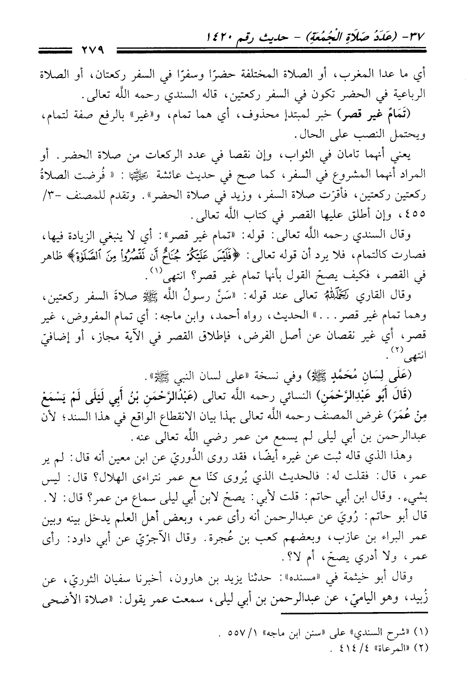 وقال القاري رحمه الله تعالى عند قوله: "سَنَّ رسولُ الله -صلى الله عليه وسلم- صلاةَ السفر ركعتين، وهما تمام غير قصر ... " الحديث، رواه أحمد، وابن ماجه: أي تمام المفروض، غير قصر، أي غير نقصان عن أصل الفرض، فإطلاق القصر في الآية مجاز، أو إضافيّ انتهى (¬2).