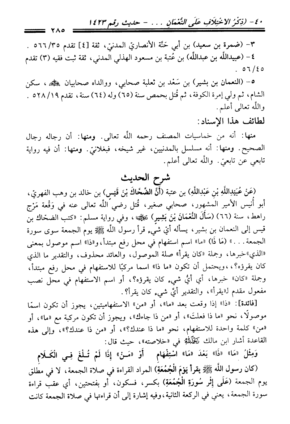 (عَنْ عُبَيْدِ اللَّهِ بْنِ عَبْدِ اللَّهِ) بن عتبة (أَنَّ الضَّحَّاكَ بنَ قَيْسٍ) بن خالد بن وهب الفهريّ، أبو أُنيس الأمير المشهور، صحابي صغير، قُتل رضي الله تعالى عنه في وَقْعة مَرْج راهط، سنة (66) (سَأَلَ النُّعْمَانَ بْنَ بَشِيرٍ) -رضي الله عنهما-، وفي رواية مسلم: "كتب الضحّاك بن قيس إلى النعمان بن بشير، يسأله أيّ شيء قرأ رسول الله -صلى الله عليه وسلم- يوم الجمعة سوى سورة الجمعة ... " (مَاذَا) "ما" اسم استفهام في محل رفع مبتدأ، و"ذا" اسم موصول بمعنى "الذي" خبرها، وجملة "كان يقرأ" صلة الموصول، والعائد محذوف، والتقدير ما الذى كان يقرؤه؟،، ويحتمل أن تكون "ماذا" اسما مركباً للاستفهام في محل رفع مبتدأ، وجملة "كان" خبرها، أي أيُّ شيء كان يقرؤه؟، أو اسم الاستفهام في محل نصب مفعول مقدم لـ"يقرأ"، والتقدير أيَّ شيء كان يقرأ؟.