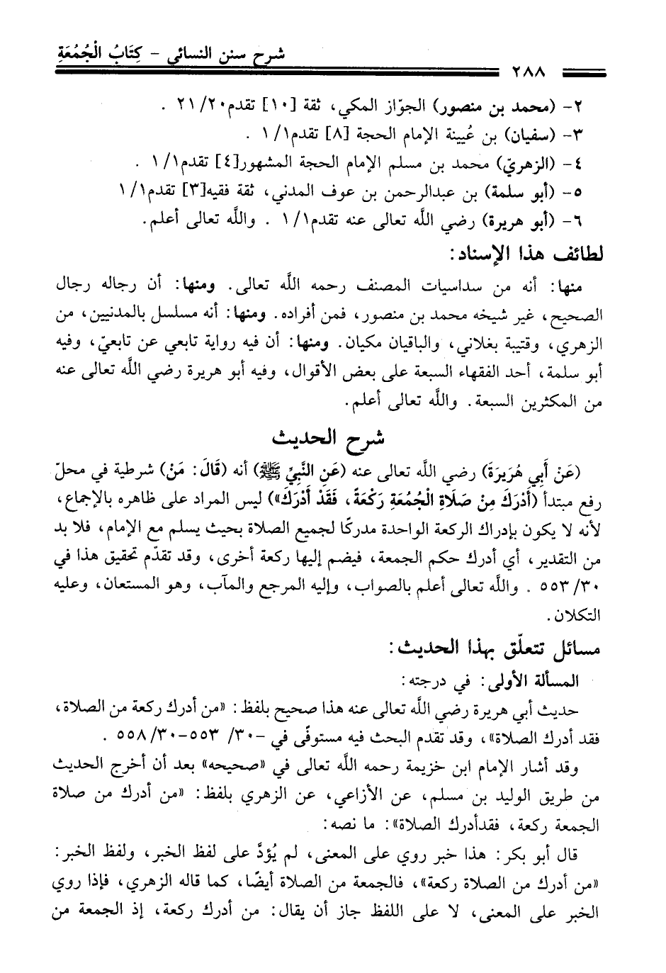 منها: أنه من سداسيات المصنف رحمه الله تعالى. ومنها: أن رجاله رجال الصحيح، غير شيخه محمد بن منصور، فمن أفراده. ومنها: أنه مسلسل بالمدنيين، من الزهري، وقتيبة بغلاني، والباقيان مكيان. ومنها: أن فيه رواية تابعي عن تابعيّ، وفيه أبو سلمة، أحد الفقهاء السبعة على بعض الأقوال، وفيه أبو هريرة رضي الله تعالى عنه من المكثرين السبعة. والله تعالى أعلم.