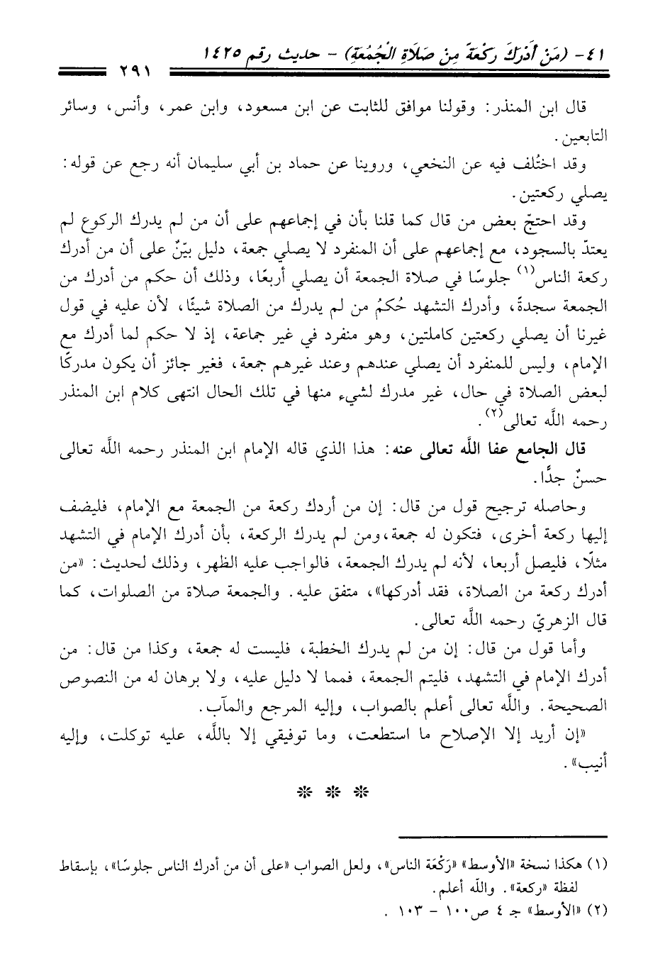 قال الجامع عفا الله تعالى عنه: هذا الذي قاله الإمام ابن المنذر رحمه الله تعالى حسنٌ جدّاً.