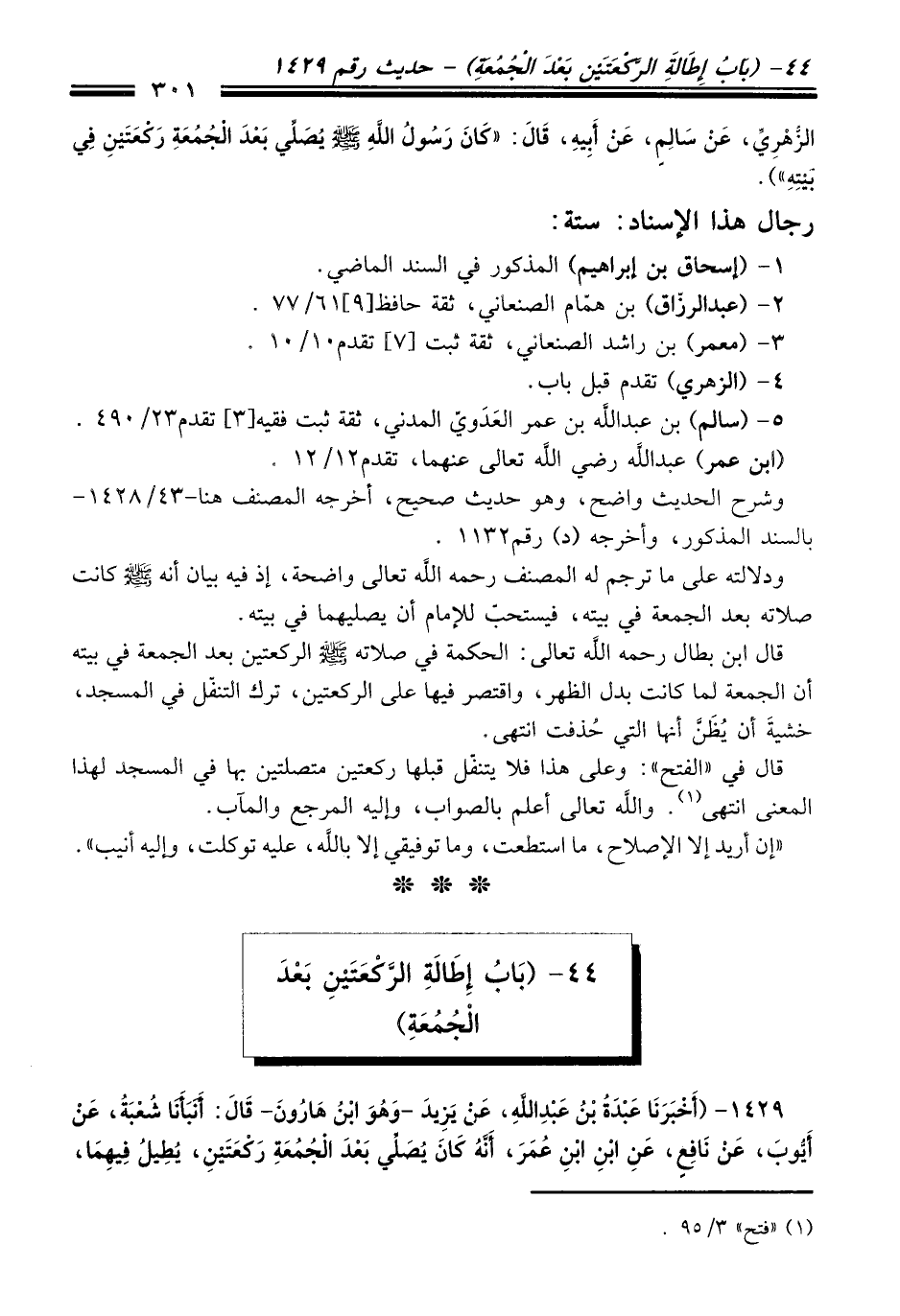 الزُّهْرِيِّ، عَنْ سَالِمٍ، عَنْ أَبِيهِ، قَالَ: "كَانَ رَسُولُ اللَّهِ -صلى الله عليه وسلم- يُصَلِّي بَعْدَ الْجُمُعَةِ رَكْعَتَيْنِ فِي بَيْتِهِ").