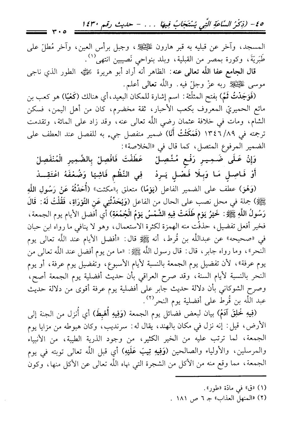 (وَهُوَ) عطف على الضمير الفاعل (يَوْمًا) متعلق بـ"مكثت" (أُحَدِّثُهُ عَنْ رَسُولِ اللهِ -صلى الله عليه وسلم-) جملة في محل نصب على الحال من الفاعل (وَيُحَدِّثُنِي عَنِ التَّوْرَاةِ، فَقُلْتُ لَهُ: قَالَ رَسُولُ الله -صلى الله عليه وسلم-: خَيْرُ يَوْمٍ طَلَعَتْ فِيهِ الشَّمْسُ يَوْمُ الْجُمُعَةِ) أي أفضل الأيام يوم الجمعة، فخير أفعل تفضيل، حذفت منه الهمزة لكثرة الاستعمال، وهو لا ينافي ما رواه ابن حبان في "صحيحه" عن عبد الله بن قُرط، أنه -صلى الله عليه وسلم- قال: "أفضل الأيام عند الله تعالى يوم النحر"، وما رواه جابر، قال: قال رسول الله -صلى الله عليه وسلم-: "ما من يوم أفضل عند الله تعالى من يوم عرفة", لأن تفضيل يوم الجمعة بالنسبة الأيام الأسبوع، وتفضيل يوم عرفة، أو يوم النحر بالنسبة لأيام السنة، وقد صرح العراقي بأن حديث أفضلية يوم الجمعة أصح، وصرح الشوكاني بأن دلالة حديث جابر على أفضلية يوم عرفة أقوى من دلالة حديث عبد الله بن قُرط على أفضلية يوم النحر (¬2).