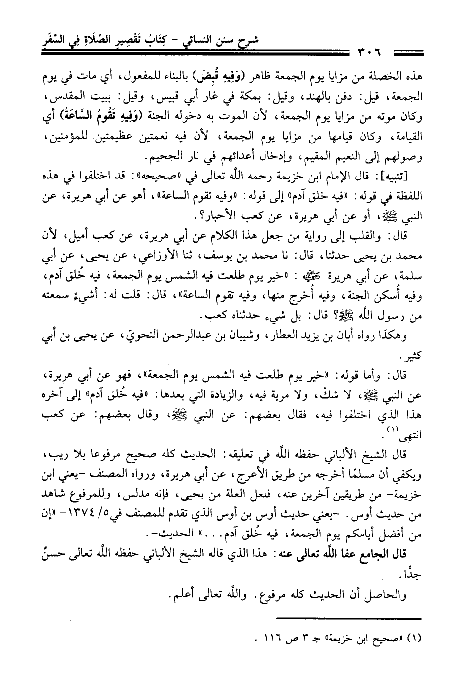 [تنبيه]: قال الإِمام ابن خزيمة رحمه الله تعالى في "صحيحه": قد اختلفوا في هذه اللفظة في قوله: "فيه خلق آدم" إلى قوله: "وفيه تقوم الساعة"، أهو عن أبي هريرة، عن النبي -صلى الله عليه وسلم-، أو عن أبي هريرة، عن كعب الأحبار؟.