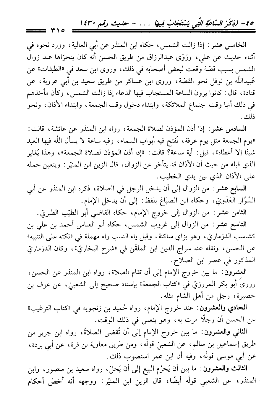 الثاني والعشرون: ما بين خروج الإِمام إلى أن تُقضى الصلاةُ، رواه ابن جرير من طريق إسماعيل بن سالم، عن الشعبيّ قولَه، ومن طريق معاوية بن قرة، عن أبي بردة، عن أبي موسى قولَه، وفيه أن ابن عمر استصوب ذلك.