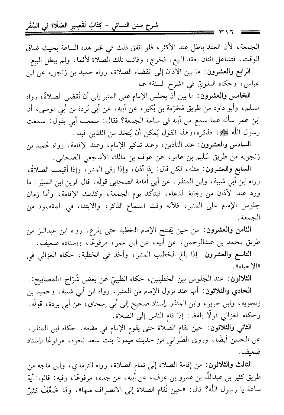 الخامس والعشرون: ما بين أن يجلس الإِمام على المنبر إلى أن تُقضى الصلاةُ، رواه مسلم، وأبو داود من طريق مَخرَمة بن بُكير، عن أبيه، عن أبي بُردة بن أبي موسى، أن ابن عمر سأله عما سمع من أبيه في ساعة الجمعة؟ فقال: سمعت أبي يقول: سمعت رسول الله -صلى الله عليه وسلم-، فذكره، وهذا القول يُمكن أن يُتخذ من اللذين قبله.