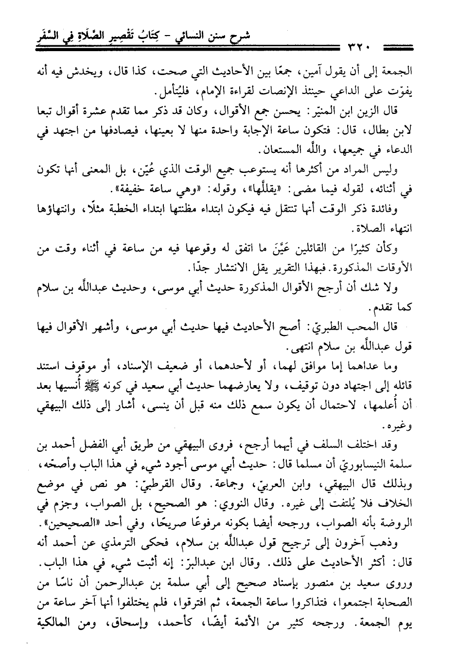 وذهب آخرون إلى ترجيح قوله عبد الله بن سلام، فحكى الترمذي عن أحمد أنه قال: أكثر الأحاديث على ذلك. وقال ابن عبد البرّ: إنه أثبت شيء في هذا الباب. وروى سعيد بن منصور بإسناد صحيح إلى أبي سلمة بن عبد الرحمن أن ناساً من الصحابة اجتمعوا، فتذاكروا ساعة الجمعة، ثم افترقوا، فلم يختلفوا أنها آخر ساعة من يوم الجمعة. ورجحه كثير من الأئمة أيضاً، كأحمد، وإسحاق، ومن المالكية