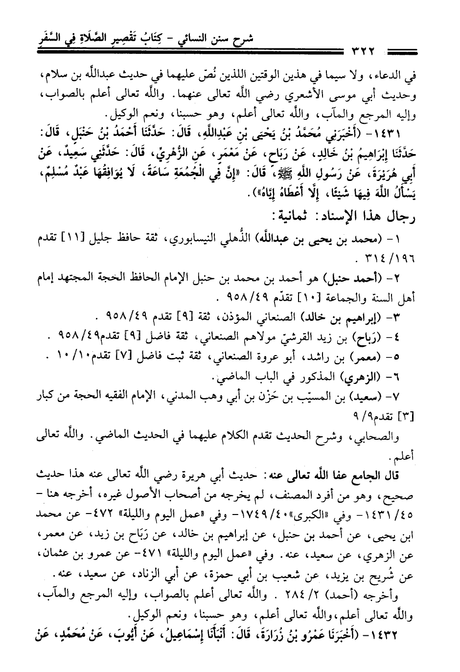 1431 - (أَخْبَرَنِي مُحَمَّدُ بْنُ يَحْيَى بْنِ عَبْدِ اللَّهِ, قَالَ: حَدَّثَنَا أَحْمَدُ بْنُ حَنْبَلٍ, قَالَ: حَدَّثَنَا إِبْرَاهِيمُ بْنُ خَالِدٍ, عَنْ رَبَاحٍ, عَنْ مَعْمَرٍ, عَنِ الزُّهْرِيِّ, قَالَ: حَدَّثَنِي سَعِيدٌ عَنْ أَبِي هُرَيْرَةَ عَنْ رَسُولِ اللَّهِ - صلى الله عليه وسلم - قَالَ: «إِنَّ فِي الْجُمُعَةِ سَاعَةً لاَ يُوَافِقُهَا عَبْدٌ مُسْلِمٌ يَسْأَلُ اللَّهَ فِيهَا شَيْئًا إِلاَّ أَعْطَاهُ إِيَّاهُ»).