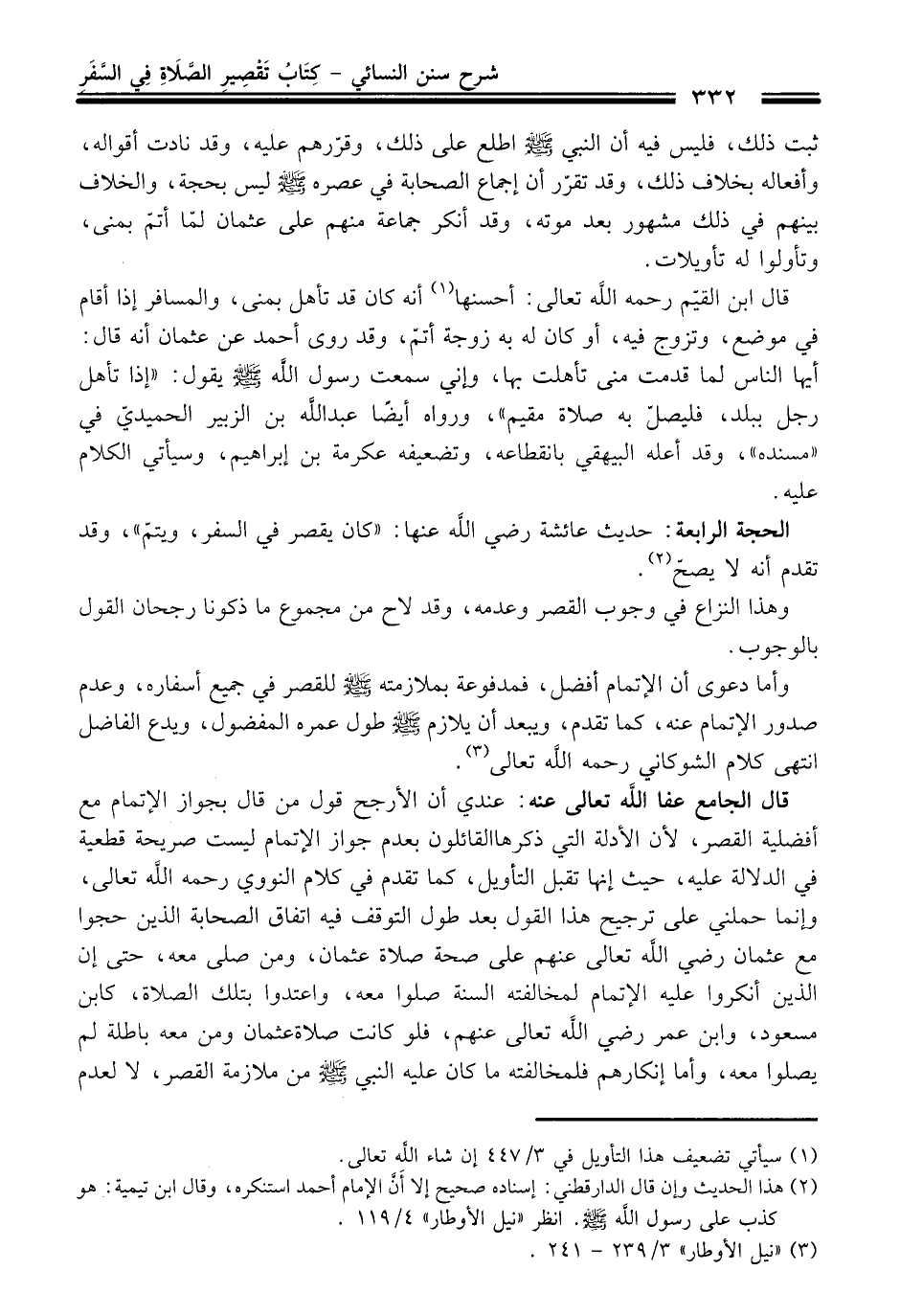 الحجة الرابعة: حديث عائشة - رضي اللَّه عنها -: "كان يقصر في السفر، ويتمّ"، وقد تقدم أنه لا يصحّ (¬2).