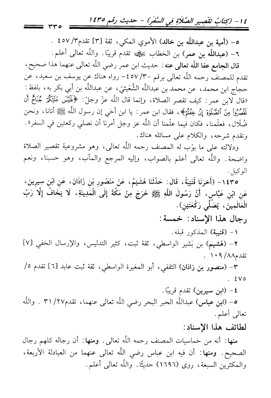 قال الجامع - عفا اللَّه تعالى عنه -: حديث ابن عمر - رضي اللَّه تعالى عنهما - هذا صحيح، تقدم للمصنف -رحمه اللَّه تعالى- برقم -3/ 457 - رواه هناك عن يوسف بن سعيد، عن حجاج ابن محمد، عن محمد بن عبد اللَّه الشُّعَيثيّ، عن عبد اللَّه بن أبي بكر به، بلفظ: "قال لابن عمر: كيف تقصر الصلاة، وإنما قال اللَّه -عَزَّ وَجَلَّ-: {فَلَيْسَ عَلَيْكُمْ جُنَاحٌ أَنْ تَقْصُرُوا مِنَ الصَّلَاةِ إِنْ خِفْتُمْ}، فقال ابن عمر: يا ابن أخي إن رسول اللَّه - صلى اللَّه عليه وسلم - أتانا، ونحن ضُلّال، فعلّمنا، فكان فيما علّمنا أن اللَّه -عَزَّ وَجَلَّ- أمرنا أن نصلي ركعتين في السفر". وتقدم شرحه، والكلام على مسائله هناك.