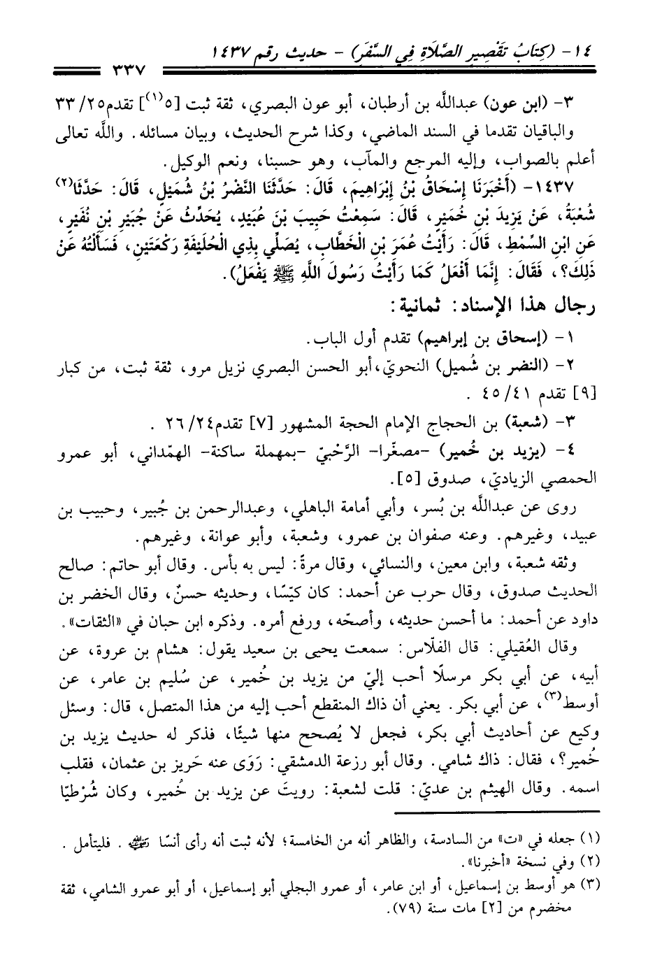 1437 - (أَخْبَرَنَا إِسْحَاقُ بْنُ إِبْرَاهِيمَ, قَالَ: حَدَّثَنَا النَّضْرُ بْنُ شُمَيْلٍ, قَالَ: حَدَّثَنَا (¬2) شُعْبَةُ, عَنْ يَزِيدَ بْنِ خُمَيْرٍ, قَالَ: سَمِعْتُ حَبِيبَ بْنَ عُبَيْدٍ, يُحَدِّثُ عَنْ جُبَيْرِ بْنِ نُفَيْرٍ, عَنِ ابْنِ السِّمْطِ, قَالَ: رَأَيْتُ عُمَرَ بْنَ الْخَطَّابِ, يُصَلِّي بِذِى الْحُلَيْفَةِ رَكْعَتَيْنِ, فَسَأَلْتُهُ عَنْ ذَلِكَ؟ , فَقَالَ: إِنَّمَا أَفْعَلُ كَمَا رَأَيْتُ رَسُولَ اللَّهِ - صلى اللَّه عليه وسلم - يَفْعَلُ).