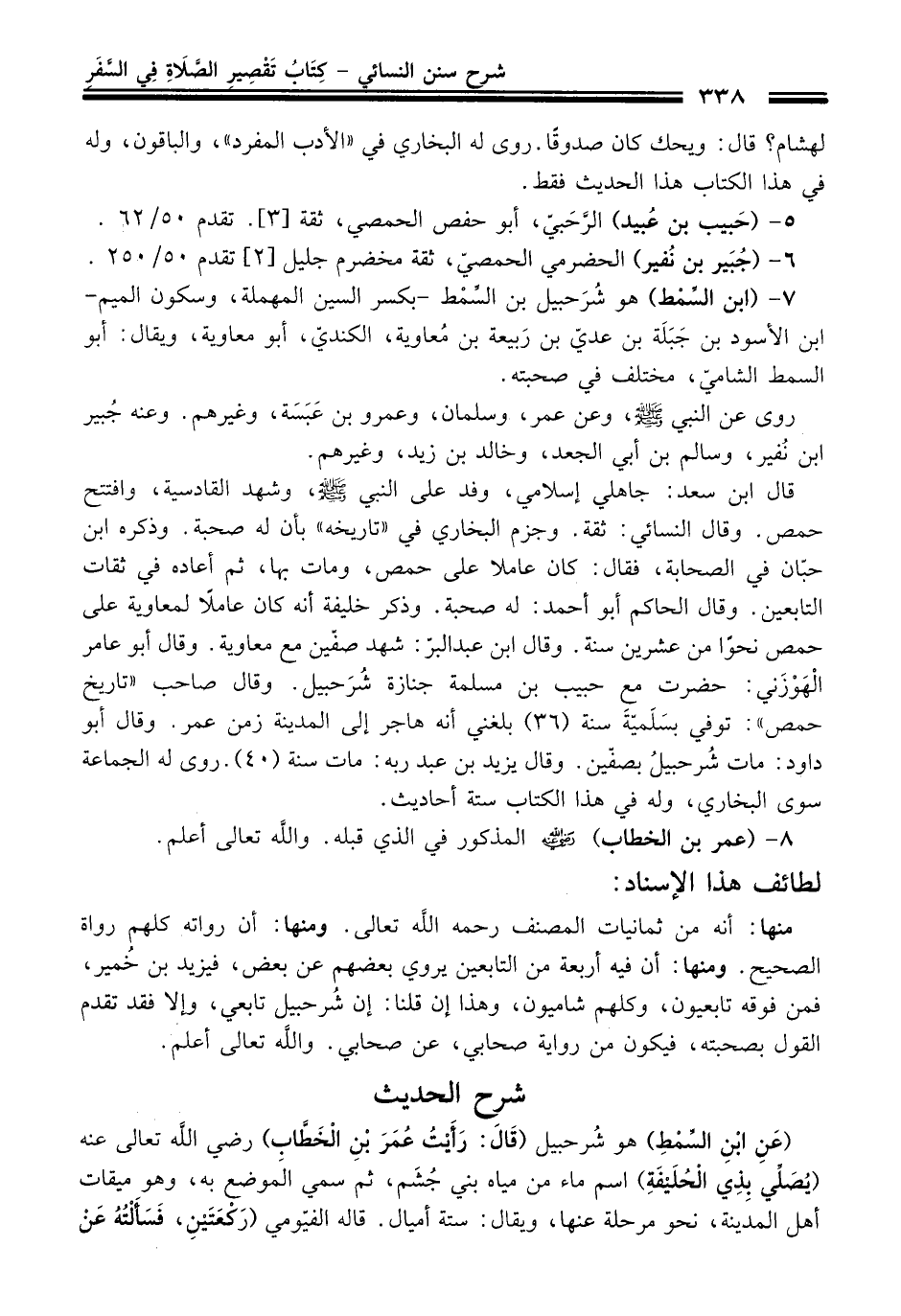 منها: أنه من ثمانيات المصنف -رحمه اللَّه تعالى-. ومنها: أن رواته كلهم رواة الصحيح. ومنها: أن فيه أربعة من التابعين يروي بعضهم عن بعض، فيزيد بن خُمير، فمن فوقه تابعيون، وكلهم شاميون، وهذا إن قلنا: إن شُرحبيل تابعي، وإلا فقد تقدم القول بصحبته، فيكون من رواية صحابي، عن صحابي. واللَّه تعالى أعلم.