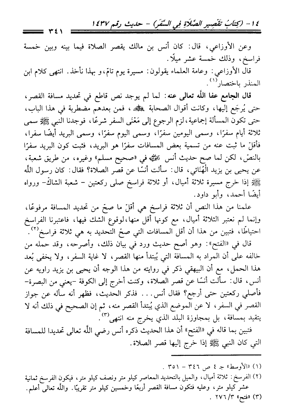 فتبين بما قاله في "الفتح" أن هذا الحديث ذكره أنس - رضي اللَّه تعالى - تحديدا للمسافة التي كان النبي - صلى اللَّه عليه وسلم - إذا خرج إليها قصر الصلاة.