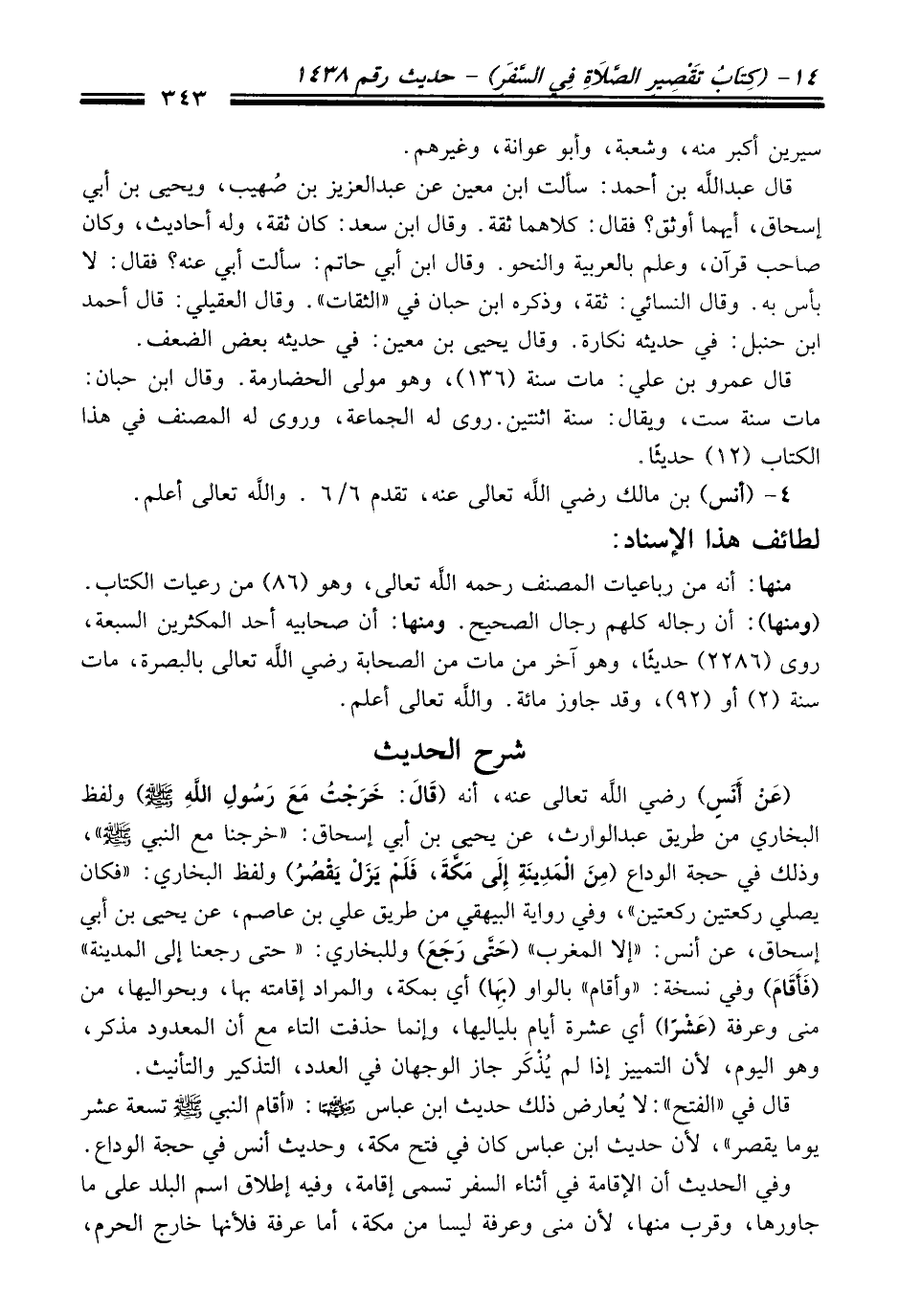(عَنْ أَنسٍ) - رضي اللَّه تعالى عنه -، أنه (قَالَ: خَرَجْتُ مَعَ رَسُولِ اللهِ - صلى اللَّه عليه وسلم -) ولفظ البخاري من طريق عبد الوارث، عن يحيى بن أبي إسحاق: "خرجنا مع النبي - صلى اللَّه عليه وسلم -"، وذلك في حجة الوداع (مِنَ الْمَدِينَةِ إِلَى مَكةَ، فَلَمْ يَزَلْ يَقْصُرُ) ولفظ البخاري: "فكان يصلي ركعتين ركعتين"، وفي رواية البيهقي من طريق علي بن عاصم، عن يحيى بن أبي إسحاق، عن أنس: "إلا المغرب" (حَتَّى رَجَعَ) وللبخاري: "حتى رجعنا إلى المدينة" (فَأَقَامَ) وفي نسخة: "وأقام" بالواو (بِهَا) أي بمكة، والمراد إقامته بها، وبحواليها، من مني وعرفة (عَشْرًا) أي عشرة أيام بلياليها، وإنما حذفت التاء مع أن المعدود مذكر، وهو اليوم, لأن التمييز إذا لم يُذْكَر جاز الوجهان في العدد، التذكير والتأنيث.