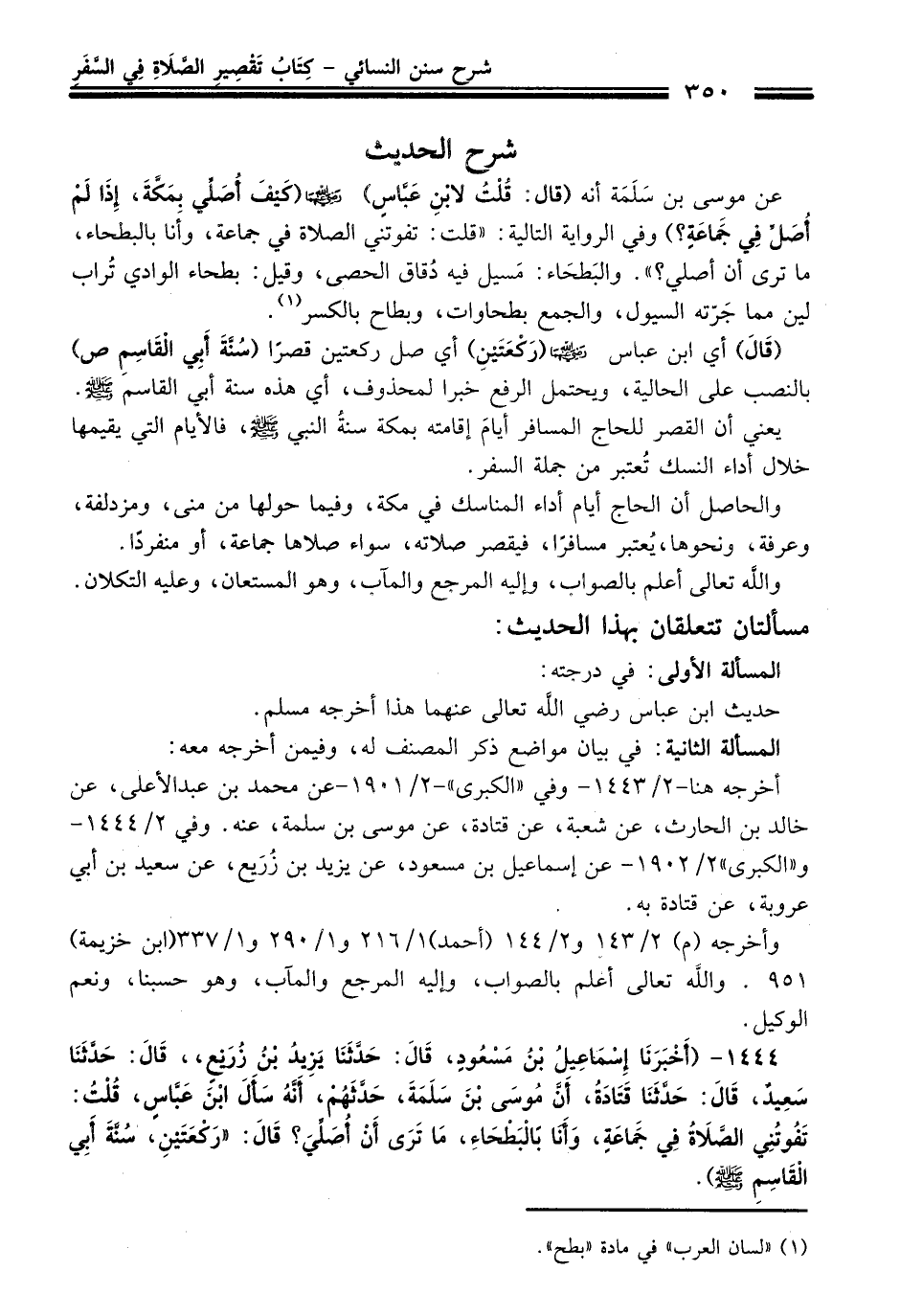 1444 - (أَخْبَرَنَا إِسْمَاعِيلُ بْنُ مَسْعُودٍ, قَالَ: حَدَّثَنَا يَزِيدُ بْنُ زُرَيْعٍ,, قَالَ: حَدَّثَنَا سَعِيدٌ, قَالَ: حَدَّثَنَا قَتَادَةُ, أَنَّ مُوسَى بْنَ سَلَمَةَ, حَدَّثَهُمْ, أَنَّهُ سَأَلَ ابْنَ عَبَّاسٍ, قُلْتُ: تَفُوتُنِي الصَّلاَةُ فِي جَمَاعَةٍ, وَأَنَا بِالْبَطْحَاءِ, مَا تَرَى أَنْ أُصَلِّيَ؟ قَالَ: رَكْعَتَيْنِ, سُنَّةَ أَبِي الْقَاسِمِ - صلى اللَّه عليه وسلم -).