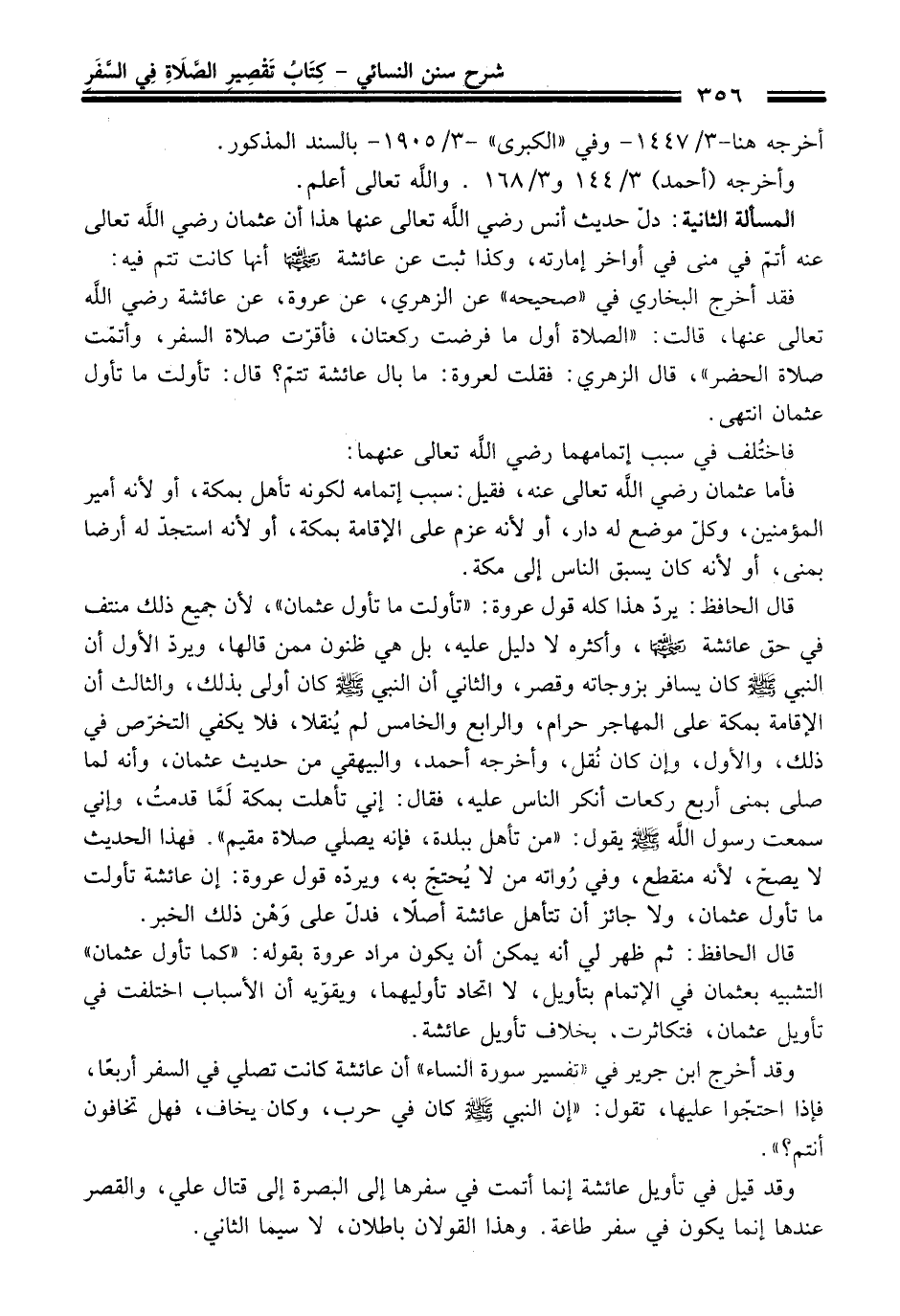 المسألة الثانية: دلّ حديث أنس - رضي اللَّه تعالى عنها - هذا أن عثمان - رضي اللَّه تعالى عنه - أتمّ في مني في أواخر إمارته، وكذا ثبت عن عائشة - رضي اللَّه عنها - أنها كانت تتم فيه: