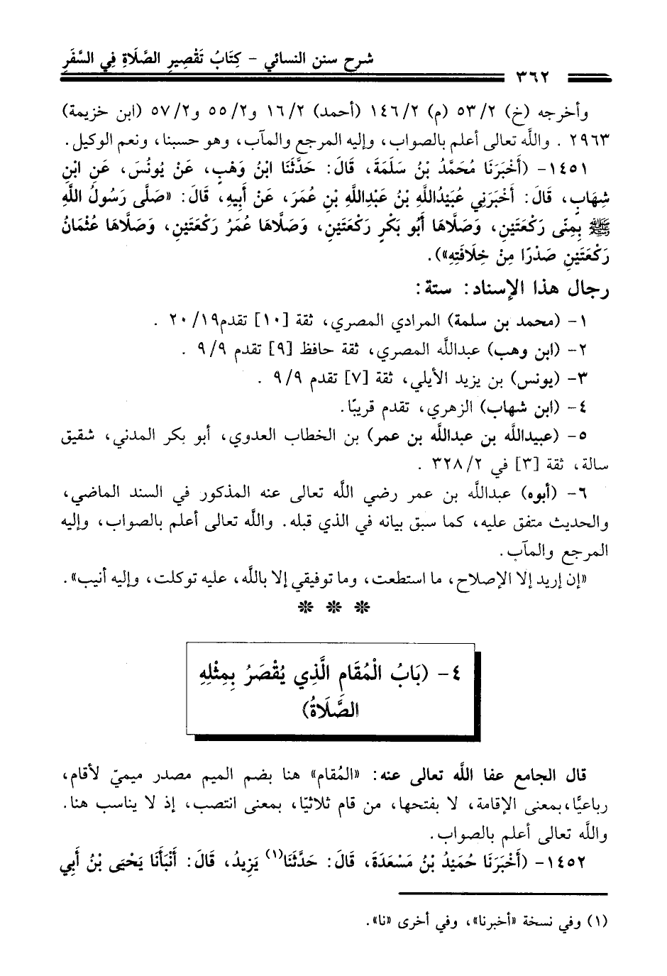 1451 - (أَخْبَرَنَا مُحَمَّدُ بْنُ سَلَمَةَ, قَالَ: حَدَّثَنَا ابْنُ وَهْبٍ, عَنْ يُونُسَ, عَنِ ابْنِ شِهَابٍ, قَالَ: أَخْبَرَنِي عُبَيْدُ اللَّهِ بْنُ عَبْدِ اللَّهِ بْنِ عُمَرَ, عَنْ أَبِيهِ, قَالَ: "صَلَّى رَسُولُ اللَّهِ - صلى اللَّه عليه وسلم - بِمِنًى رَكْعَتَيْنِ, وَصَلاَّهَا أَبُو بَكْرٍ رَكْعَتَيْنِ, وَصَلاَّهَا عُمَرُ رَكْعَتَيْنِ, وَصَلاَّهَا عُثْمَانُ صَدْرًا مِنْ خِلاَفَتِهِ").