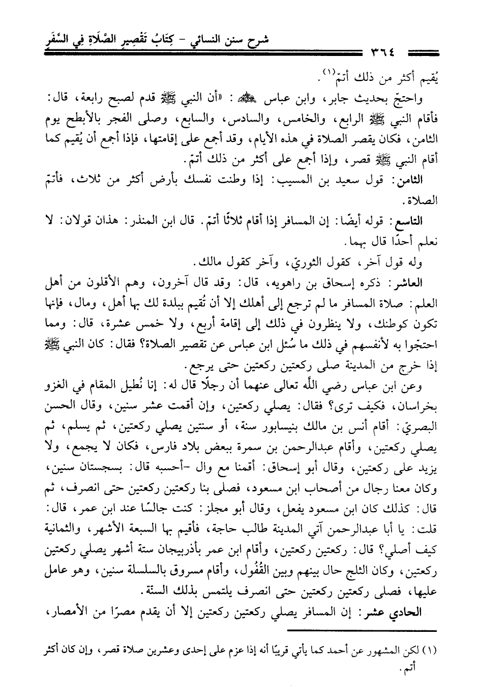 وعن ابن عباس - رضي اللَّه تعالى عنهم - أن رجلًا قال له: إنا نُطيل المقام في الغزو بخراسان، فكيف ترى؟ فقال: يصلي ركعتين، وإن أقمت عشر سنين، وقال الحسن البصريّ: أقام أنس بن مالك بنيسابور سنة، أو سنتين يصلي ركعتين، ثم يسلم، ثم يصلي ركعتين، وأقام عبد الرحمن بن سمرة ببعصْ بلاد فارس، فكان لا يجمع، ولا يزيد على ركعتين، وقال أبو إسحاق: أقمنا مع وال -أحسبه قال: بسجستان سنين، وكان معنا رجال من أصحاب ابن مسعود، فصلى بنا ركعتين ركعتين حتى انصرف، ثم قال: كذلك كان ابن مسعود يفعل، وقال أبو مجلز: كنت جالسًا عند ابن عمر، قال: قلت: يا أبا عبد الرحمن آتي المدينة طالب حاجة، فأقيم بها السبعة الأشهر، والثمانية كيف أصلي؟ قال: ركعتين ركعتين، وأقام ابن عمر بأذربيجان ستة أشهر يصلي ركعتين ركعتين وكان الثلج حال بينهم وبين القُفُول، وأقام مسروق بالسلسلة سنين، وهو عامل عليها، فصلى ركعتين ركعتين حتى انصرف يلتمس بذلك السنّة.