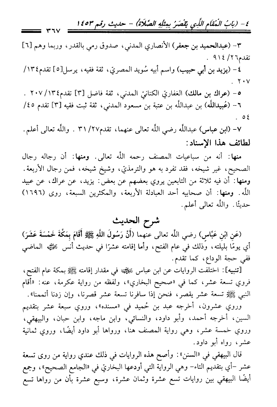 [تنبيه]: اختلفت الروايات عن ابن عباس - رضي اللَّه عنهما - في مقدار إقامته - صلى اللَّه عليه وسلم - بمكة عام الفتح، فروي تسعة عشر، كما في "صحيح البخاري"، ولفظه من رواية عكرمة، عنه: "أقام النبي - صلى اللَّه عليه وسلم - تسعة عشر يقصر، فنحن إذا سافرنا تسعة عشر قصرنا، وإن زدنا أتممنا".