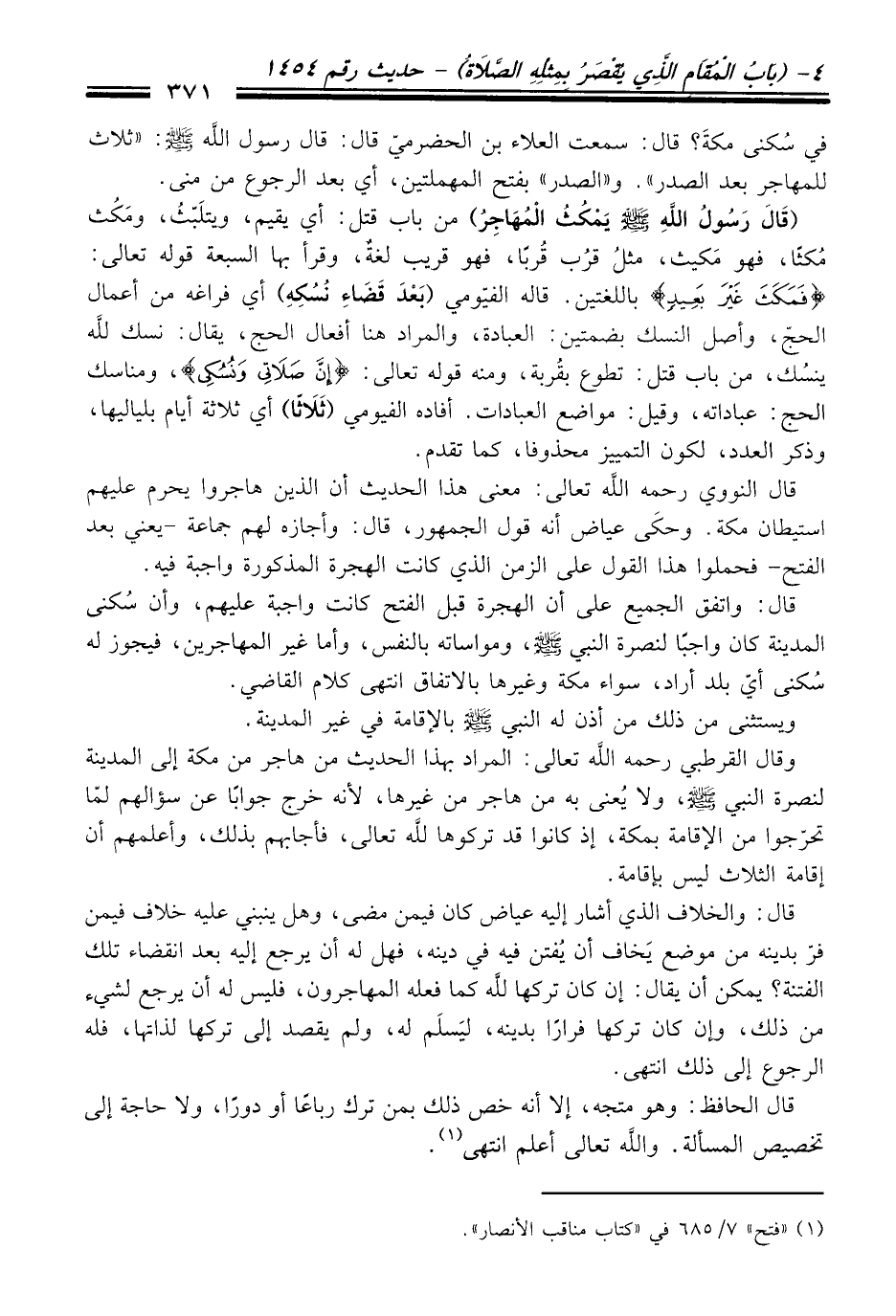 في سُكنى مكةَ؟ قال: سمعت العلاء بن الحضرميّ قال: قال رسول اللَّه - صلى اللَّه عليه وسلم -: "ثلاث للمهاجر بعد الصدر". و"الصدر" بفتح المهملتين، أي بعد الرجوع من مني.