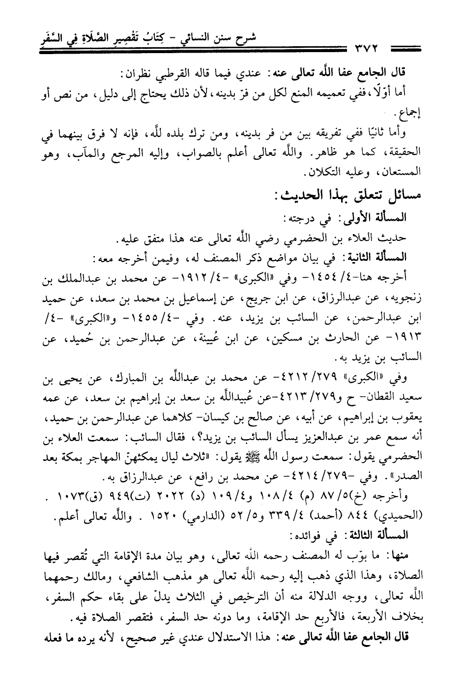 وفي "الكبرى" 279/ 4212 - عن محمد بن عبد اللَّه بن المبارك، عن يحيى بن سعيد القطان- ح و 279/ 4213 - عن عُبيد اللَّه بن سعد بن إبراهيم بن سعد، عن عمه يعقوب بن إبراهيم، عن أبيه، عن صالح بن كيسان- كلاهما عن عبد الرحمن بن حميد، أنه سمع عمر بن عبد العزيز يسأل السائب بن يزيد؟، فقال السائب: سمعت العلاء بن الحضرمي يقول: سمعت رسول اللَّه - صلى اللَّه عليه وسلم - يقول: "ثلاث ليال يمكثهنّ المهاجر بمكة بعد الصدر". وفي -279/ 4214 - عن محمد بن رافع، عن عبد الرزاق به.