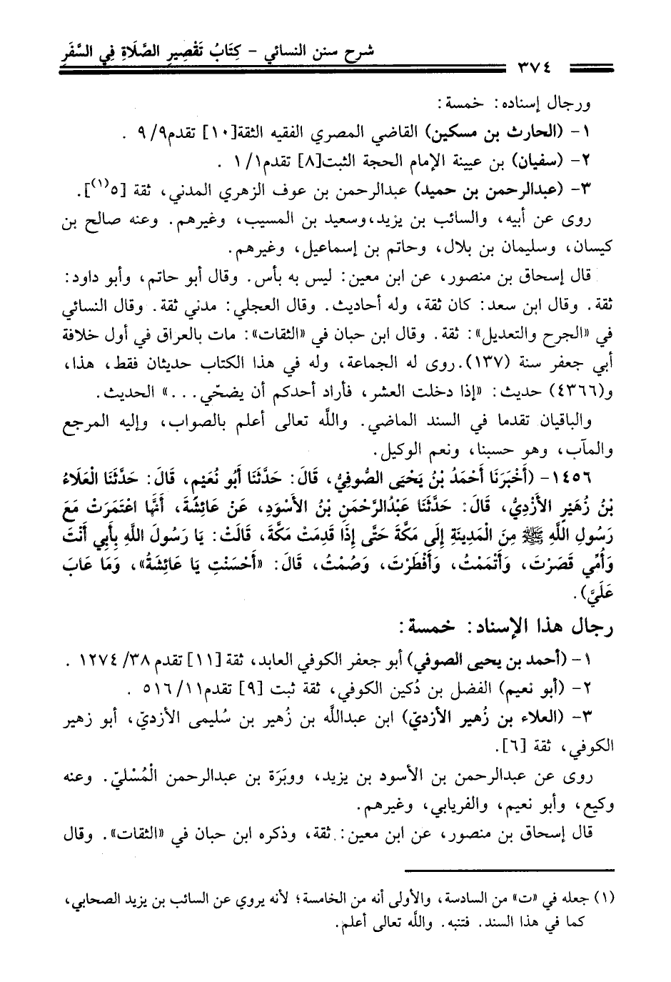 1456 - (أَخْبَرَنِي أَحْمَدُ بْنُ يَحْيَى الصُّوفِيُّ, قَالَ: حَدَّثَنَا أَبُو نُعَيْمٍ, قَالَ: حَدَّثَنَا الْعَلاَءُ بْنُ زُهَيْرٍ الأَزْدِيُّ, قَالَ: حَدَّثَنَا عَبْدُ الرَّحْمَنِ بْنُ الأَسْوَدِ, عَنْ عَائِشَةَ, أَنَّهَا اعْتَمَرَتْ مَعَ رَسُولِ اللَّهِ - صلى اللَّه عليه وسلم - مِنَ الْمَدِينَةِ إِلَى مَكَّةَ حَتَّى إِذَا قَدِمَتْ مَكَّةَ, قَالَتْ: يَا رَسُولَ اللَّهِ بِأَبِي أَنْتَ وَأُمِّي قَصَرْتَ, وَأَتْمَمْتُ, وَأَفْطَرْتَ, وَصُمْتُ, قَالَ: «أَحْسَنْتِ يَا عَائِشَةُ». وَمَا عَابَ عَلَيَّ).