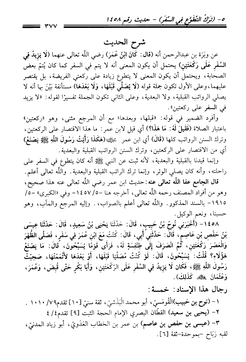 1458 - (أَخْبَرَنِي نُوحُ بْنُ حَبِيبٍ, قَالَ: حَدَّثَنَا يَحْيَى بْنُ سَعِيدٍ, قَالَ: حَدَّثَنَا عِيسَى بْنُ حَفْصِ بْنِ عَاصِمٍ, قَالَ: حَدَّثَنِي أَبِي, قَالَ: كُنْتُ مَعَ ابْنِ عُمَرَ فِي سَفَرٍ فَصَلَّى الظُّهْرَ وَالْعَصْرَ رَكْعَتَيْنِ, ثُمَّ انْصَرَفَ إِلَى طِنْفِسَةٍ لَهُ, فَرَأَى قَوْمًا يُسَبِّحُونَ, قَالَ: مَا يَصْنَعُ هَؤُلاَءِ؟ قُلْتُ: يُسَبِّحُونَ. قَالَ: لَوْ كُنْتُ مُصَلِّيًا قَبْلَهَا, أَوْ بَعْدَهَا لأَتْمَمْتُهَا, صَحِبْتُ رَسُولَ اللَّهِ - صلى اللَّه عليه وسلم -, فَكَانَ لاَ يَزِيدُ فِي السَّفَرِ عَلَى الرَّكْعَتَيْنِ, وَأَبَا بَكْرٍ حَتَّى قُبِضَ, وَعُمَرَ, وَعُثْمَانَ - رضي اللَّه عنهم - كَذَلِكَ).