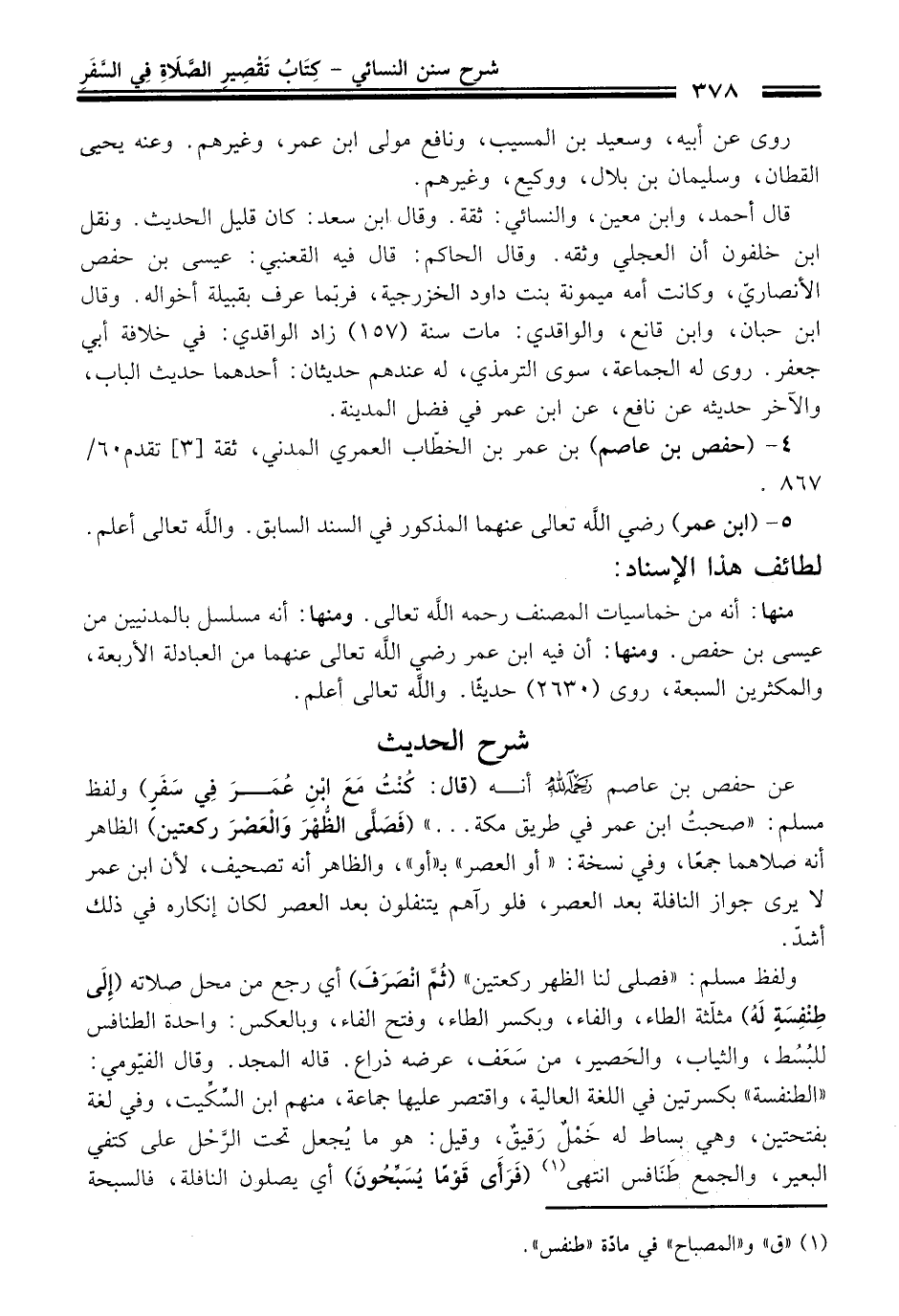 عن حفص بن عاصم -رحمه اللَّه- أنه (قال: كُنْتُ مَعَ ابْنِ عُمَرَ فِي سَفَرٍ) ولفظ مسلم: "صحبتُ ابن عمر في طريق مكة ... " (فَصَلَّى الظُّهْرَ وَالْعَصْرَ ركعتين) الظاهر أنه صلاهما جمعًا، وفي نسخة: "أو العصر" بـ "أو"، والظاهر أنه تصحيف, لأن ابن عمر لا يرى جواز النافلة بعد العصر، فلو رآهم يتنفلون بعد العصر لكان إنكاره في ذلك أشدّ.