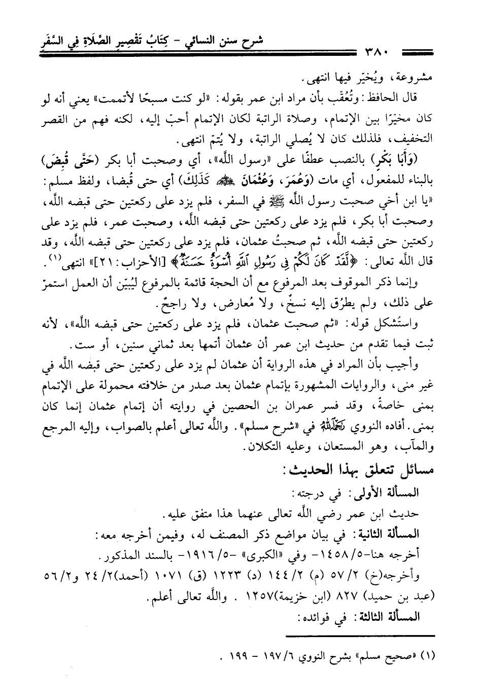 وأجيب بأن المراد في هذه الرواية أن عثمان لم يزد على ركعتين حتى قبضه اللَّه في غير منى، والروايات المشهورة بإتمام عثمان بعد صدر من خلافته محمولة على الإتمام بمنى خاصةً، وقد فسر عمران بن الحصين في روايته أن إتمام عثمان إنما كان بمنى. أفاده النووي -رحمه اللَّه - في "شرح مسلم". واللَّه تعالى أعلم بالصواب، وإليه المرجع والمآب، وهو المستعان، وعليه التكلان.