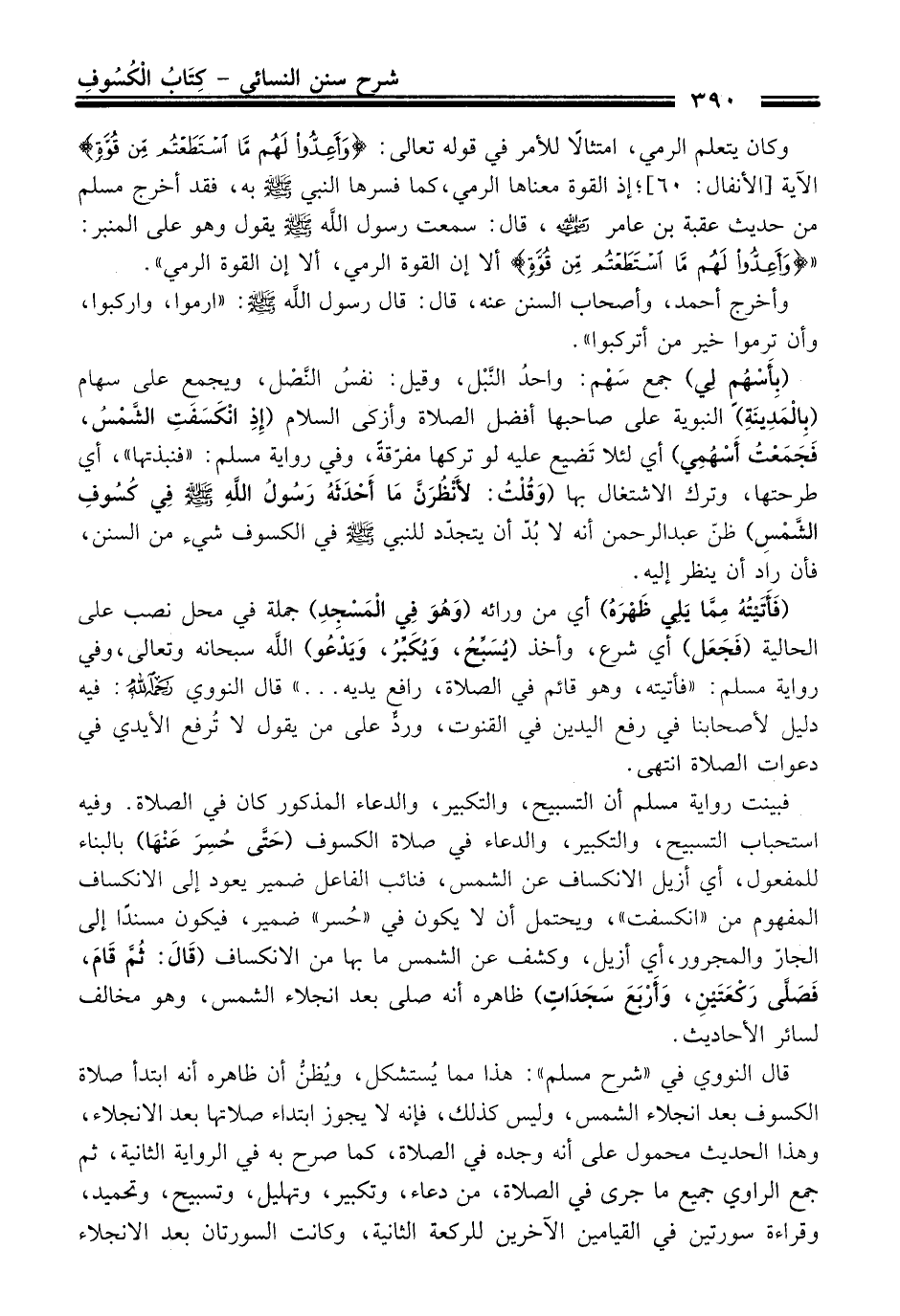 فبينت رواية مسلم أن التسبيح، والتكبير، والدعاء المذكور كان في الصلاة. وفيه استحباب التسبيح، والتكبير، والدعاء في صلاة الكسوف (حَتَّى حُسِرَ عَنْهَا) بالبناء للمفعول، أي أزيل الانكساف عن الشمس، فنائب الفاعل ضمير يعود إلى الانكساف المفهوم من "انكسفت"، ويحتمل أن لا يكون في "حُسر" ضمير، فيكون مسندًا إلى الجارّ والمجرور، أي أزيل، وكشف عن الشمس ما بها من الانكساف (قَالَ: ثُمَّ قَامَ، فَصَلَّى رَكْعَتَيْنِ، وَأَرْبَعَ سَجَدَاتٍ) ظاهره أنه صلى بعد إنجلاء الشمس، وهو مخالف لسائر الأحاديث.