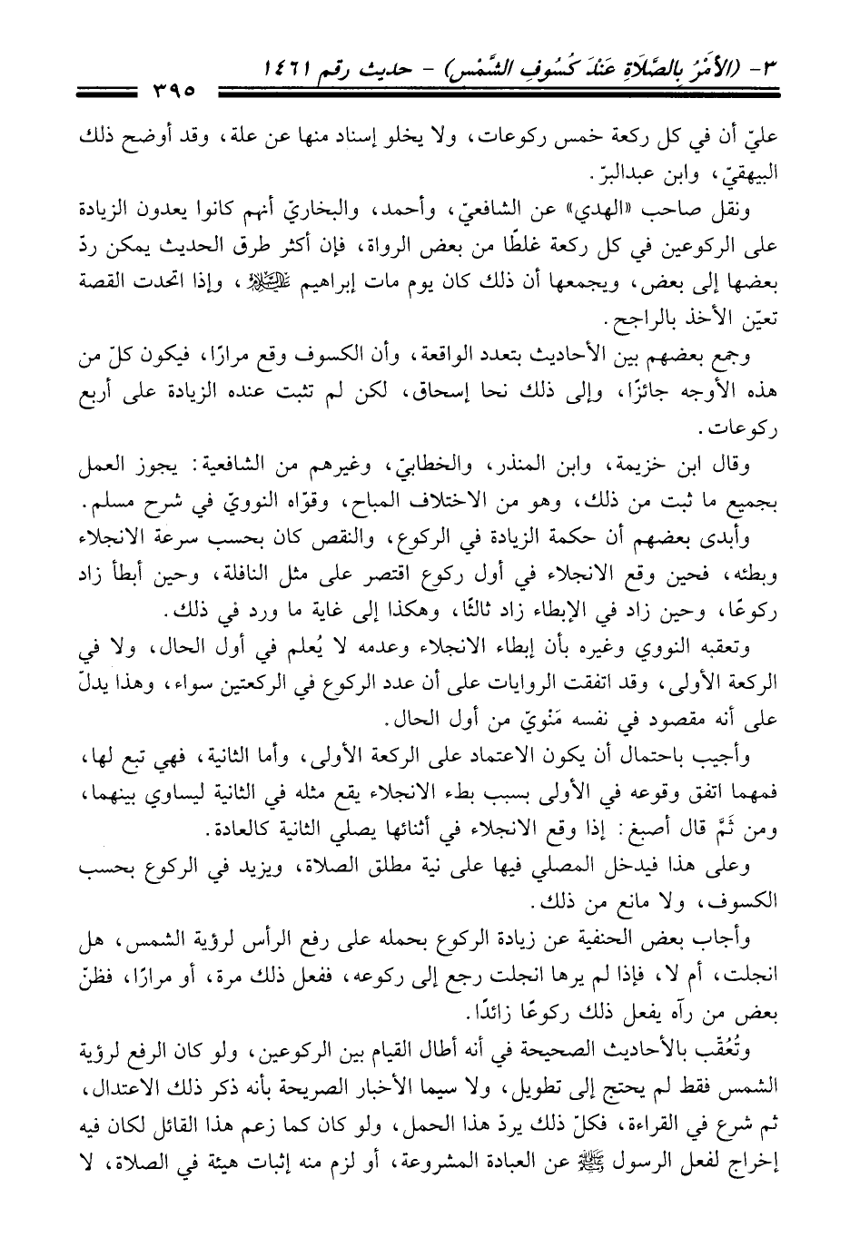 ونقل صاحب "الهدي" عن الشافعيّ، وأحمد، والبخاريّ أنهم كانوا يعدون الزيادة على الركوعين في كل ركعة غلطًا من بعض الرواة، فإن أكثر طرق الحديث يمكن ردّ بعضها إلى بعض، ويجمعها أن ذلك كان يوم مات إبراهيم - عليه السلام -، وإذا اتحدت القصة تعيّن الأخذ بالراجح.