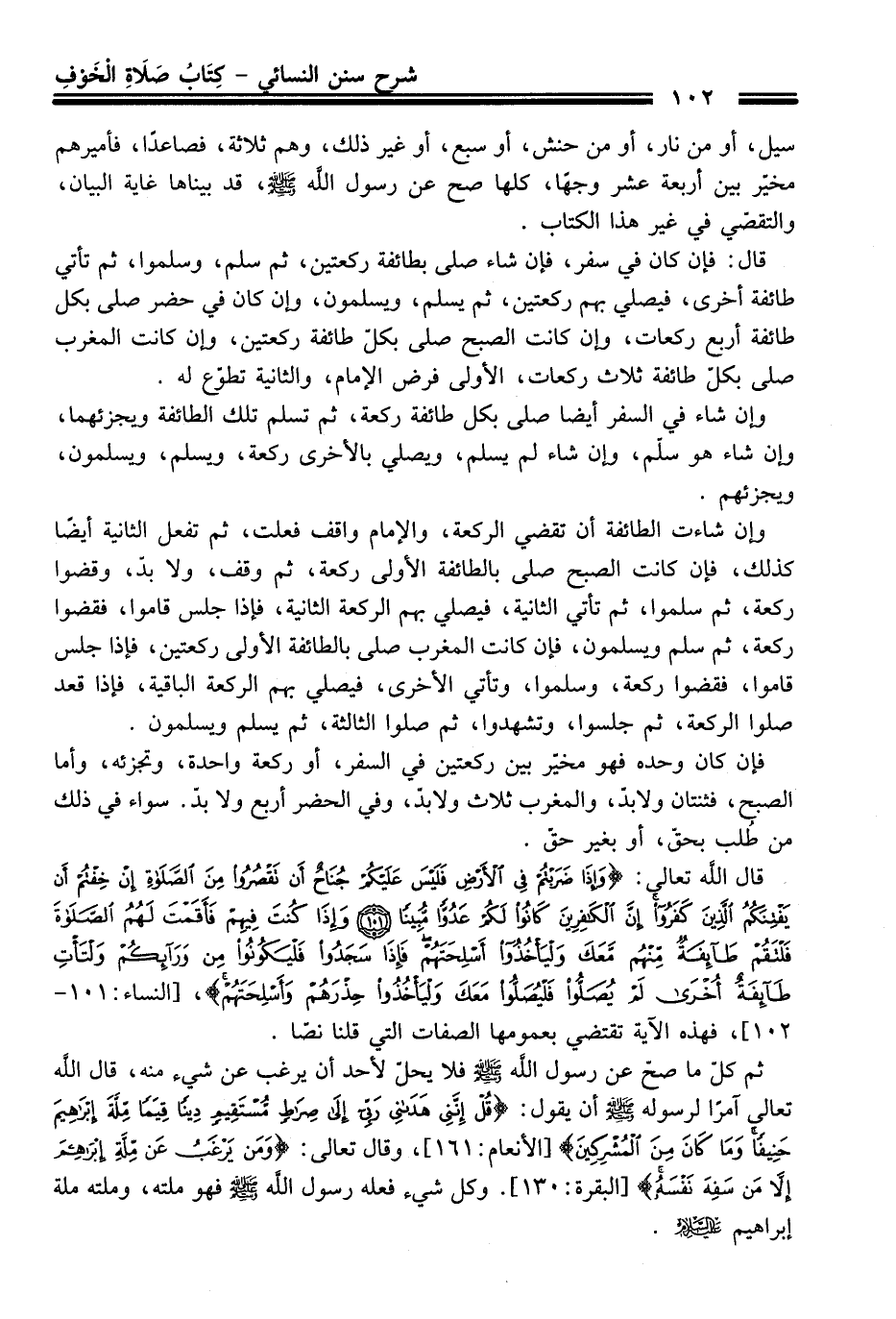 قال اللَّه تعالي: {وَإِذَا ضَرَبْتُمْ فِي الْأَرْضِ فَلَيْسَ عَلَيْكُمْ جُنَاحٌ أَنْ تَقْصُرُوا مِنَ الصَّلَاةِ إِنْ خِفْتُمْ أَنْ يَفْتِنَكُمُ الَّذِينَ كَفَرُوا إِنَّ الْكَافِرِينَ كَانُوا لَكُمْ عَدُوًّا مُبِينًا (101) وَإِذَا كُنْتَ فِيهِمْ فَأَقَمْتَ لَهُمُ الصَّلَاةَ فَلْتَقُمْ طَائِفَةٌ مِنْهُمْ مَعَكَ وَلْيَأْخُذُوا أَسْلِحَتَهُمْ فَإِذَا سَجَدُوا فَلْيَكُونُوا مِنْ وَرَائِكُمْ وَلْتَأْتِ طَائِفَةٌ أُخْرَى لَمْ يُصَلُّوا فَلْيُصَلُّوا مَعَكَ وَلْيَأْخُذُوا حِذْرَهُمْ وَأَسْلِحَتَهُمْ} [النساء: 101 - 102]، فهذه الآية تقتضي بعمومها الصفات التي قلنا نصّا.