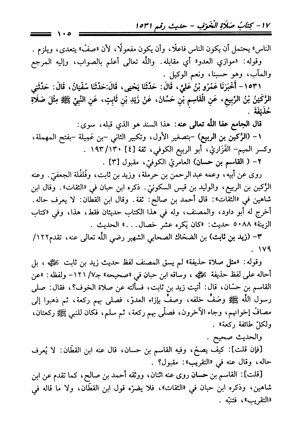 1531 - أَخْبَرَنَا عَمْرُو بْنُ عَلِيٍّ, قَالَ: حَدَّثَنَا يَحْيَى, قَالَ: حَدَّثَنَا سُفْيَانُ, قَالَ: حَدَّثَنِي الرُّكَيْنُ بْنُ الرَّبِيعِ, عَنِ الْقَاسِمِ بْنِ حَسَّانٍ, عَنْ زَيْدِ بْنِ ثَابِتٍ, عَنِ النَّبِيِّ - صلى اللَّه عليه وسلم - مِثْلَ صَلاَةِ حُذَيْفَةَ.
