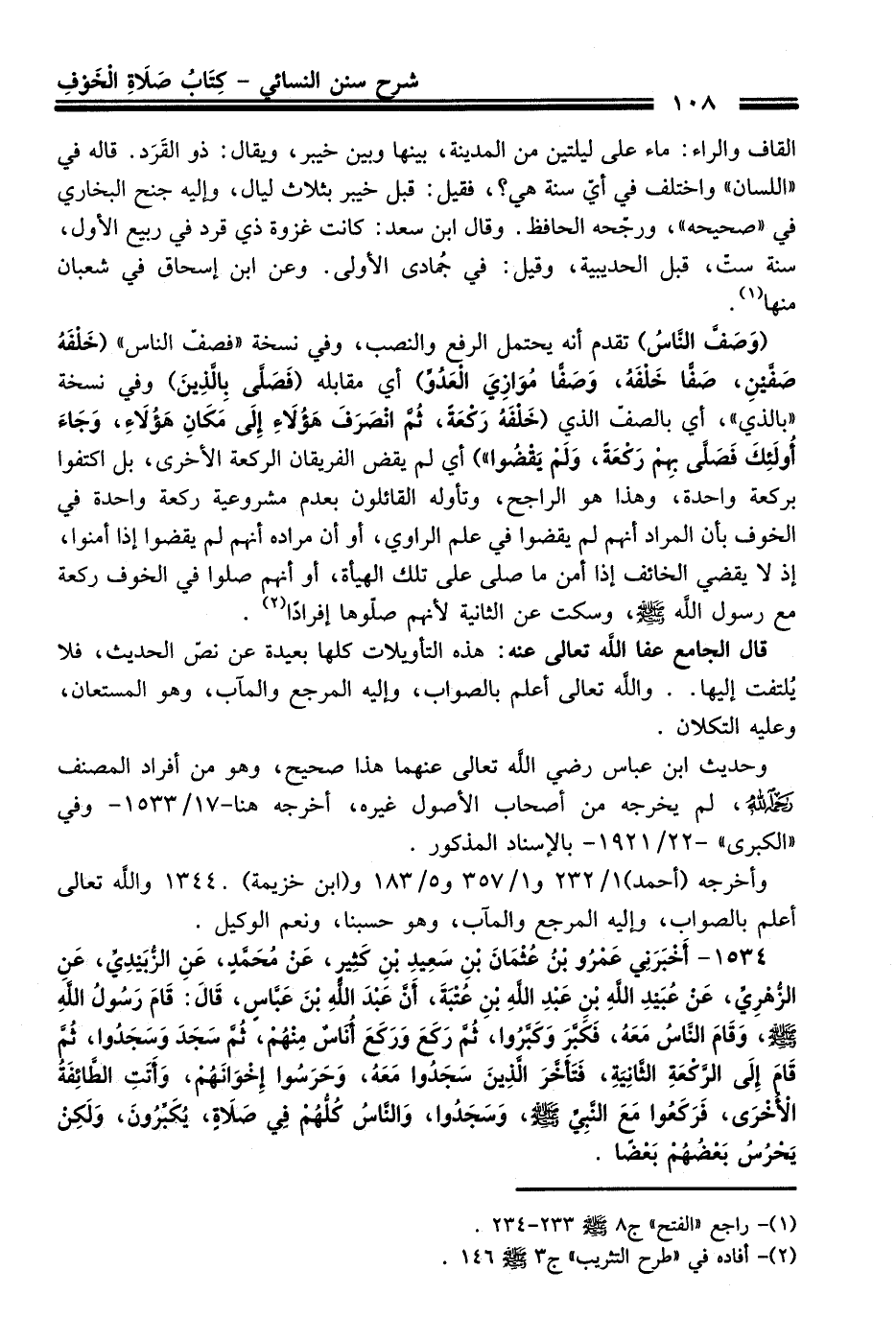 1534 - أَخْبَرَنِي عَمْرُو بْنُ عُثْمَانَ بْنِ سَعِيدِ بْنِ كَثِيرٍ, عَنْ مُحَمَّدٍ, عَنِ الزُّبَيْدِيِّ, عَنِ الزُّهْرِيِّ, عَنْ عُبَيْدِ اللَّهِ بْنِ عَبْدِ اللَّهِ بْنِ عُتْبَةَ, أَنَّ عَبْدَ اللَّهِ بْنَ عَبَّاسٍ, قَالَ: قَامَ رَسُولُ اللَّهِ - صلى اللَّه عليه وسلم -, وَقَامَ النَّاسُ مَعَهُ, فَكَبَّرَ وَكَبَّرُوا, ثُمَّ رَكَعَ وَرَكَعَ أُنَاسٌ مِنْهُمْ, ثُمَّ سَجَدَ وَسَجَدُوا, ثُمَّ قَامَ إِلَى الرَّكْعَةِ الثَّانِيَةِ, فَتَأَخَّرَ الَّذِينَ سَجَدُوا مَعَهُ, وَحَرَسُوا إِخْوَانَهُمْ, وَأَتَتِ الطَّائِفَةُ الأُخْرَى, فَرَكَعُوا مَعَ النَّبِيِّ - صلى اللَّه عليه وسلم - وَسَجَدُوا, وَالنَّاسُ كُلُّهُمْ فِي صَلاَةٍ, يُكَبِّرُونَ, وَلَكِنْ يَحْرُسُ بَعْضُهُمْ بَعْضًا.