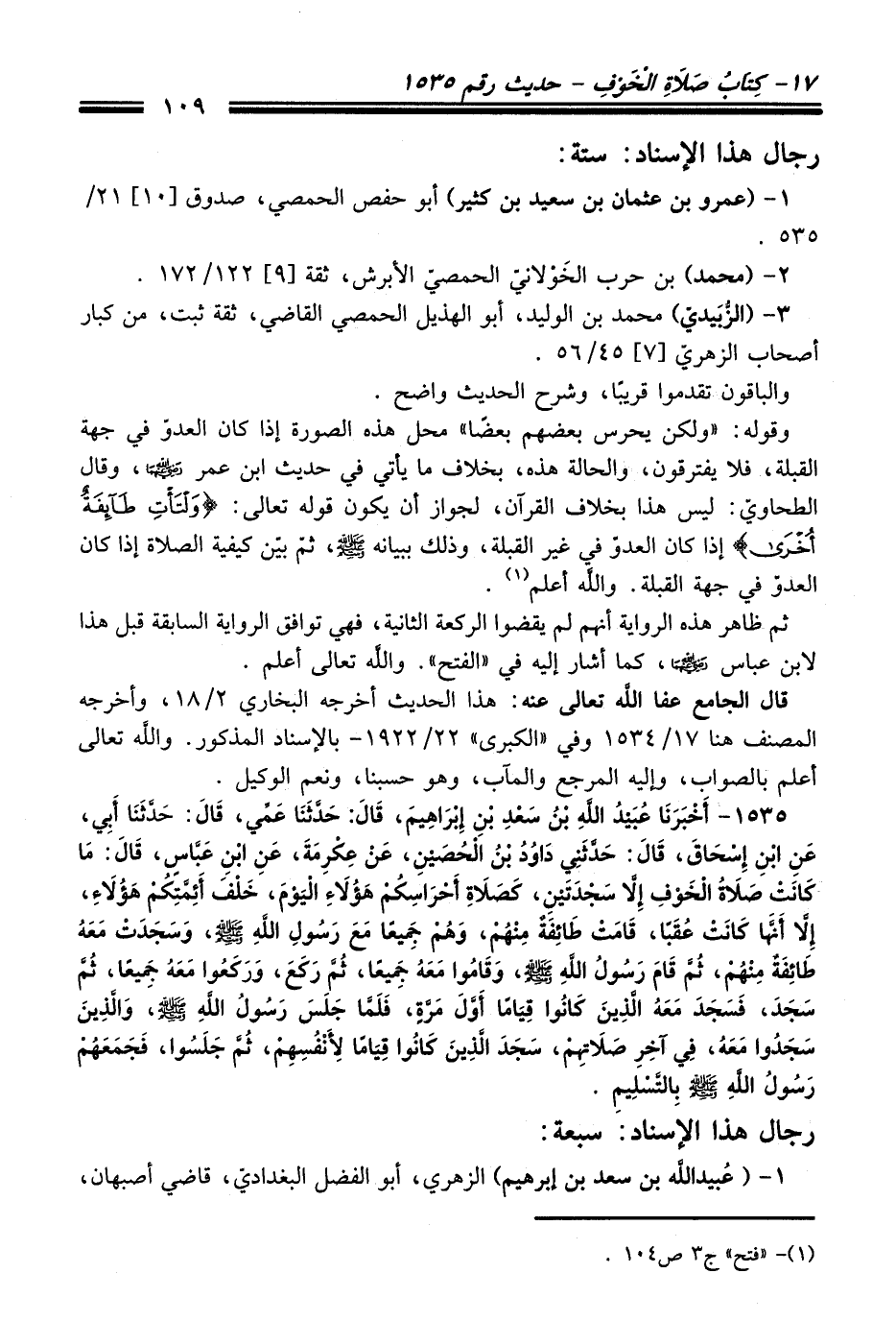 1535 - أَخْبَرَنَا عُبَيْدُ اللَّهِ بْنُ سَعْدِ بْنِ إِبْرَاهِيمَ, قَالَ: حَدَّثَنَا عَمِّي, قَالَ: حَدَّثَنَا أَبِي, عَنِ ابْنِ إِسْحَاقَ, قَالَ: حَدَّثَنِي دَاوُدُ بْنُ الْحُصَيْنِ, عَنْ عِكْرِمَةَ, عَنِ ابْنِ عَبَّاسٍ, قَالَ: مَا كَانَتْ صَلاَةُ الْخَوْفِ إِلاَّ سَجْدَتَيْنِ, كَصَلاَةِ أَحْرَاسِكُمْ هَؤُلاَءِ الْيَوْمَ, خَلْفَ أَئِمَّتِكُمْ هَؤُلاَءِ, إِلاَّ أَنَّهَا كَانَتْ عُقَبًا, قَامَتْ طَائِفَةٌ مِنْهُمْ, وَهُمْ جَمِيعًا مَعَ رَسُولِ اللَّهِ - صلى اللَّه عليه وسلم -, وَسَجَدَتْ مَعَهُ طَائِفَةٌ مِنْهُمْ, ثُمَّ قَامَ رَسُولُ اللَّهِ - صلى اللَّه عليه وسلم -, وَقَامُوا مَعَهُ جَمِيعًا, ثُمَّ رَكَعَ, وَرَكَعُوا مَعَهُ جَمِيعًا, ثُمَّ سَجَدَ, فَسَجَدَ مَعَهُ الَّذِينَ كَانُوا قِيَامًا أَوَّلَ مَرَّةٍ, فَلَمَّا جَلَسَ رَسُولُ اللَّهِ - صلى اللَّه عليه وسلم -, وَالَّذِينَ سَجَدُوا مَعَهُ, فِي آخِرِ صَلاَتِهِمْ, سَجَدَ الَّذِينَ كَانُوا قِيَامًا لأَنْفُسِهِمْ, ثُمَّ جَلَسُوا, فَجَمَعَهُمْ رَسُولُ اللَّهِ - صلى اللَّه عليه وسلم - بِالتَّسْلِيمِ.