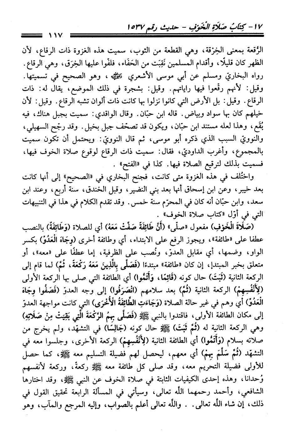 (صَلاَةَ الْخَوْفِ) مفعول "صلّى" (أَنَّ طَائِفَةً صَفَّتْ مَعَهُ) أي للصلاة (وَطَائِفَةٌ) بالنصب عطفا على "طائفة"، ويجوز الرفع على الابتداء، أي وطائفة أخرى (وِجَاهَ الْعَدُوِّ) بكسر الواو، وضمها، أي مقابل العدوّ، ونُصب على الظرفية، إما عطفًا على "معه"، أو متعدق بخبر المبتدإ، إن كان "طائفة"، مبتدءًا (فَصَلَّى بِالَّذِينَ مَعَهُ رَكْعَةً، ثُمَّ) لما قام إلى الركعة الثانية (ثَبَتَ) حال كونه (قَائِمًا، وَأتَمُّوا) أي الطائفة التي صلى بها الركعة الأولى (لأَنْفُسِهِمْ) الركعة الثانية (ثُمَّ) بعد سلامهم (انْصَرَفُوا) إلى وجه العدوّ (فَصَفُّوا وِجَاهَ الْعَدُوِّ) أي وهم في غير حالة الصلاة (وَجَاءَتِ الطائِفَةُ الأُخْرَى) التي كانت مواجهة العدوّ إلى مكان الطائفة الأولى، فاقتدوا بالنبي - صلى اللَّه عليه وسلم - (فَصَلَّى بِهمُ الرَّكْعَةَ الَّتِي بَقِيَتْ مِنْ صَلاَتهِ) وهي الركعة الثانية له (ثُمَّ ثَبَتَ) - صلى اللَّه عليه وسلم - حال كونه (جَالِسًا) في التشهْد، ولم يخرج من صلاته بسلام (وَأَتَمُّوا) أي الطائفة الثانية (لأَنْفُسِهِمْ) الركعة الأخرى، وجلسوا معه في التشقد (ثُمَّ سَلَّمَ بهِمْ) أي معهم، ليحصل لهم فضيلة التسليم معه - صلى اللَّه عليه وسلم -، كما حصل للأولى فضيلة التحريم معه، وقد صلى كل طائفة معه - صلى اللَّه عليه وسلم - ركعةً، وركعة لأنفسهم وُحدانا، وهذه إحدى الكيفيات الثابتة في صلاة الخوف عن النبي - صلى اللَّه عليه وسلم -، وقد اختارها الشافعيّ، وأحمد -رحمهما اللَّه تعالى-، وسيأتي في المسألة الرابعة تحقيق القول في ذلك، إن شاء اللَّه تعالى .. واللَّه تعالى أعلم بالصواب، وإليه المرجع والمآب، وهو