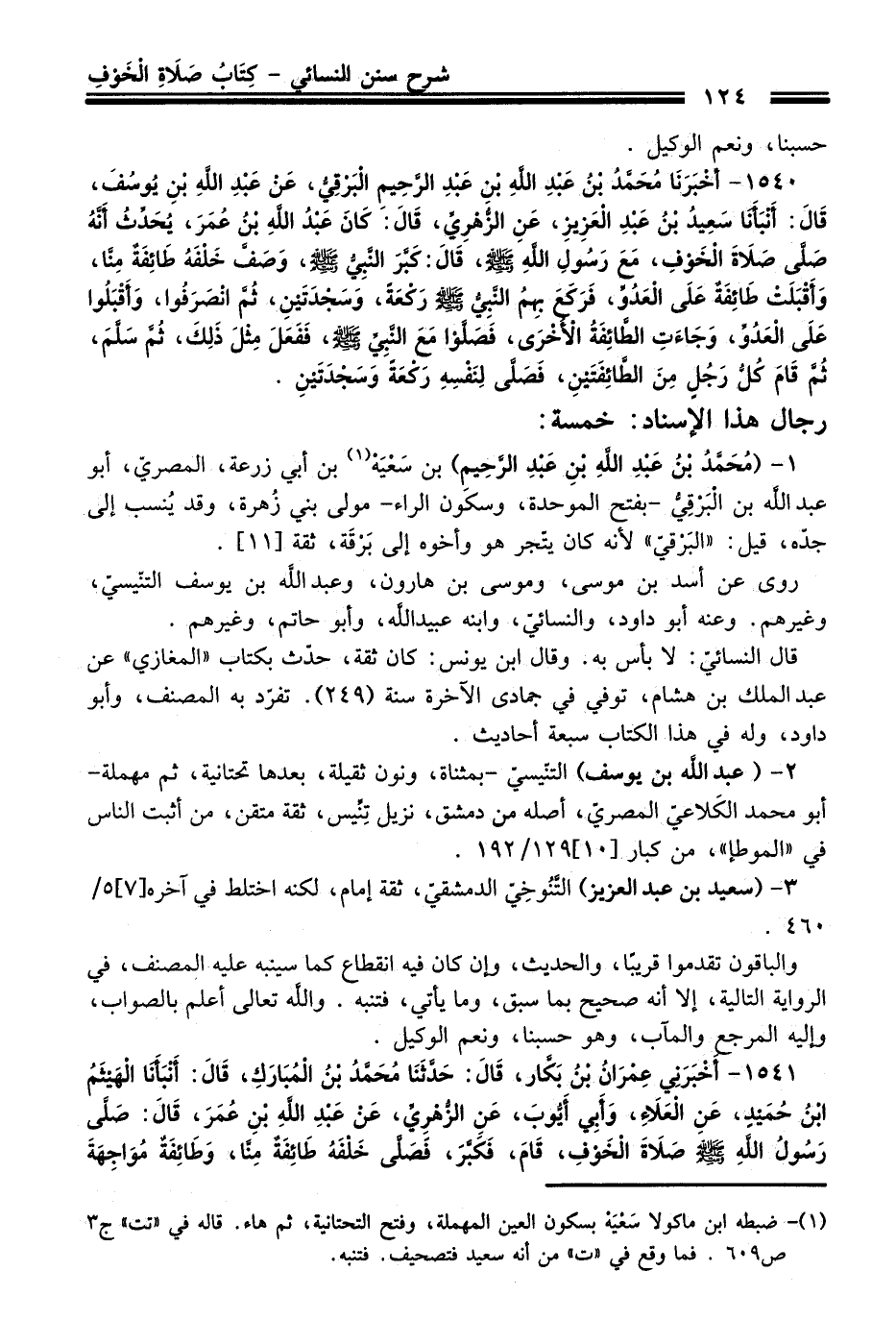 1540 - أَخْبَرَنَا مُحَمَّدُ بْنُ عَبْدِ اللَّهِ بْنِ عَبْدِ الرَّحِيمِ الْبَرْقِيُّ, عَنْ عَبْدِ اللَّهِ بْنِ يُوسُفَ, قَالَ: أَنْبَأَنَا سَعِيدُ بْنُ عَبْدِ الْعَزِيزِ, عَنِ الزُّهْرِيِّ, قَالَ: كَانَ عَبْدُ اللَّهِ بْنُ عُمَرَ, يُحَدِّثُ أَنَّهُ صَلَّى صَلاَةَ الْخَوْفِ, مَعَ رَسُولِ اللَّهِ - صلى اللَّه عليه وسلم -, قَالَ: كَبَّرَ النَّبِيُّ - صلى اللَّه عليه وسلم -, وَصَفَّ خَلْفَهُ طَائِفَةٌ مِنَّا, وَأَقْبَلَتْ طَائِفَةٌ عَلَى الْعَدُوِّ, فَرَكَعَ بِهِمُ النَّبِيُّ - صلى اللَّه عليه وسلم - رَكْعَةً وَسَجْدَتَيْنِ, ثُمَّ انْصَرَفُوا, وَأَقْبَلُوا عَلَى الْعَدُوِّ, وَجَاءَتِ الطَّائِفَةُ الأُخْرَى, فَصَلُّوا مَعَ النَّبِيِّ - صلى اللَّه عليه وسلم -, فَفَعَلَ مِثْلَ ذَلِكَ, ثُمَّ سَلَّمَ, ثُمَّ قَامَ كُلُّ رَجُلٍ مِنَ الطَّائِفَتَيْنِ, فَصَلَّى لِنَفْسِهِ رَكْعَةً وَسَجْدَتَيْنِ.