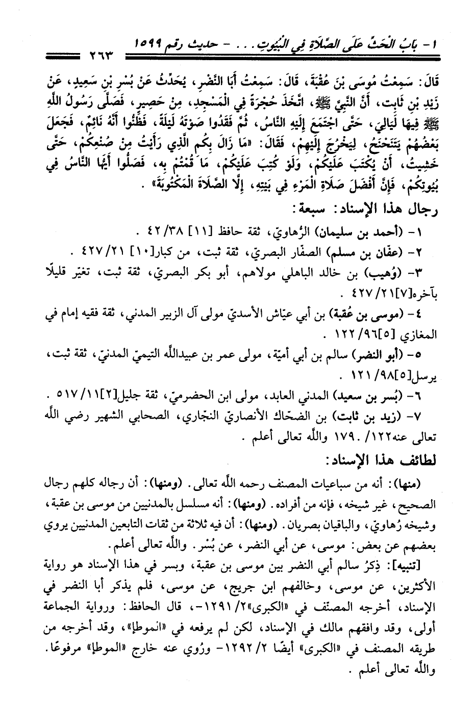 قَالَ: سَمِعْتُ مُوسَى بْنَ عُقْبَةَ, قَالَ: سَمِعْتُ أَبَا النَّضْرِ, يُحَدِّثُ عَنْ بُسْرِ بْنِ سَعِيدٍ, عَنْ زَيْدِ بْنِ ثَابِتٍ, أَنَّ النَّبِيَّ - صلى اللَّه عليه وسلم -, اتَّخَذَ حُجْرَةً فِي الْمَسْجِدِ, مِنْ حَصِيرٍ, فَصَلَّى رَسُولُ اللَّهِ - صلى اللَّه عليه وسلم - فِيهَا لَيَالِيَ, حَتَّى اجْتَمَعَ إِلَيْهِ النَّاسُ, ثُمَّ فَقَدُوا صَوْتَهُ لَيْلَةً, فَظَنُّوا أَنَّهُ نَائِمٌ, فَجَعَلَ بَعْضُهُمْ يَتَنَحْنَحُ, لِيَخْرُجَ إِلَيْهِمْ, فَقَالَ: «مَا زَالَ بِكُمُ الَّذِي رَأَيْتُ مِنْ صُنْعِكُمْ, حَتَّى خَشِيتُ, أَنْ يُكْتَبَ عَلَيْكُمْ, وَلَوْ كُتِبَ عَلَيْكُمْ, مَا قُمْتُمْ بِهِ, فَصَلُّوا أَيُّهَا النَّاسُ فِي بُيُوتِكُمْ, فَإِنَّ أَفْضَلَ صَلاَةِ الْمَرْءِ فِي بَيْتِهِ إِلاَّ الصَّلاَةَ الْمَكْتُوبَةَ».