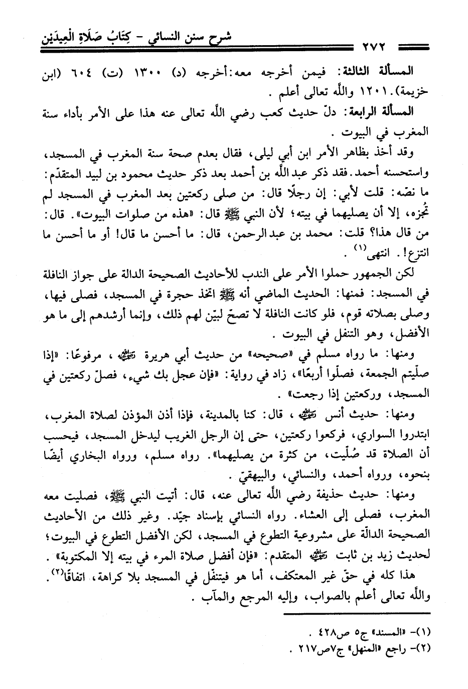 ومنها: حديث حذيفة - رضي اللَّه تعالى عنه -، قال: أتيت النبي - صلى اللَّه عليه وسلم -، فصليت معه المغرب، فصلى إلى العشاء. رواه النسائي بإسناد جيّد. وغير ذلك من الأحاديث الصحيحة الدالّة على مشروعية التطوع في المسجد، لكن الأفضل التطوع في البيوت؛ لحديث زيد بن ثابت - رضي اللَّه عنه - المتقدم: "فإن أفضل صلاة المرء في بيته إلا المكتوبة".