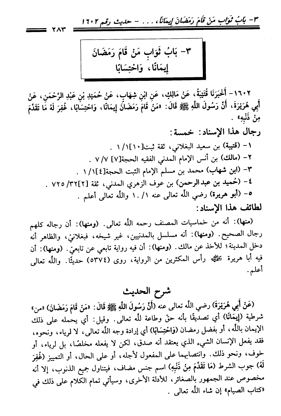 1602 - أَخْبَرَنَا قُتَيْبَةُ, عَنْ مَالِكٍ عَنِ ابْنِ شِهَابٍ, عَنْ حُمَيْدِ بْنِ عَبْدِ الرَّحْمَنِ, عَنْ أَبِي هُرَيْرَةَ, أَنَّ رَسُولَ اللَّهِ - صلى اللَّه عليه وسلم - قَالَ: «مَنْ قَامَ رَمَضَانَ إِيمَانًا, وَاحْتِسَابًا, غُفِرَ لَهُ مَا تَقَدَّمَ مِنْ ذَنْبِهِ».