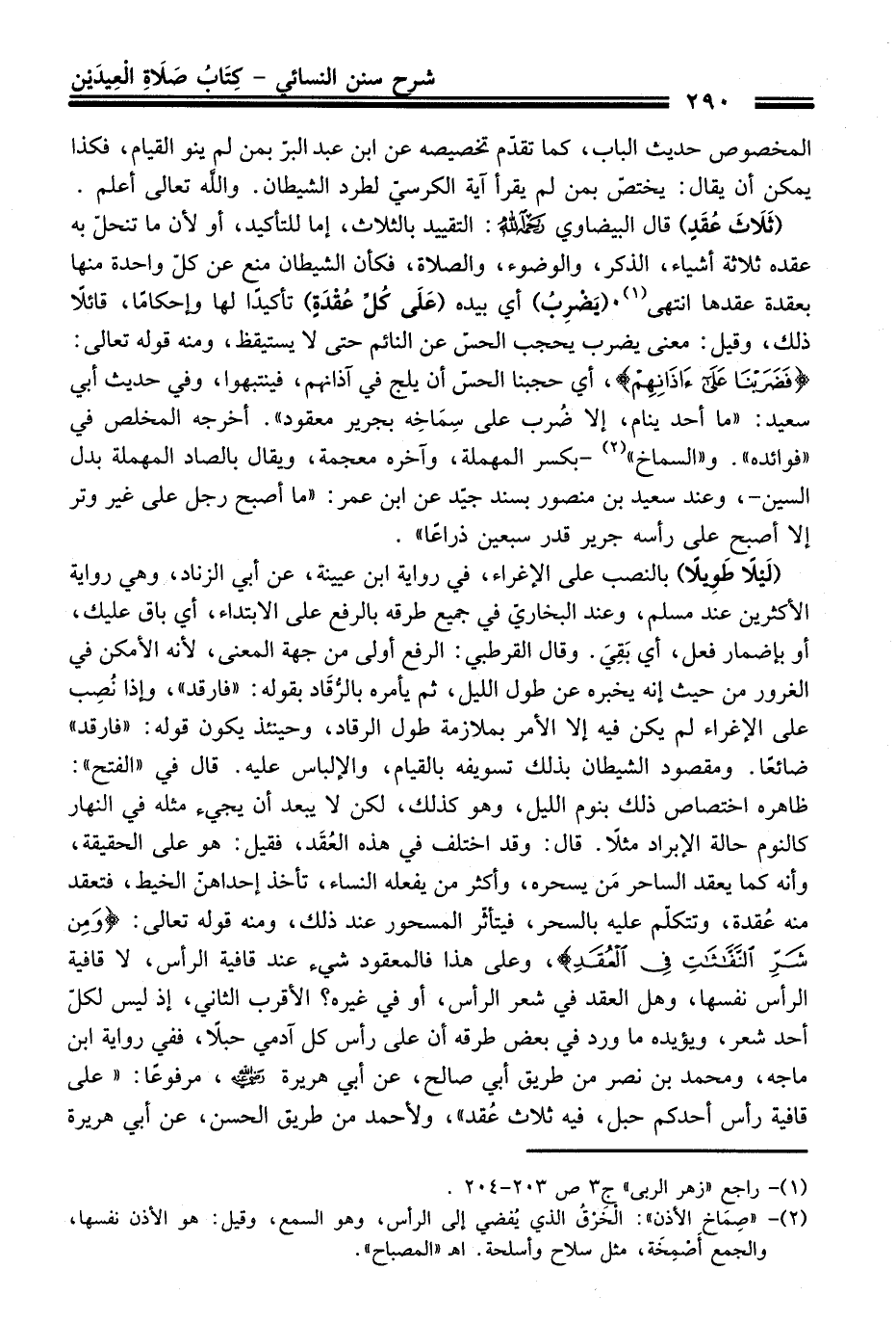 (لَيلاً طَوِيلاً) بالنصب على الإغراء، في رواية ابن عيينة، عن أبي الزناد، وهي رواية الأكثرين عند مسلم، وعند البخاري في جميع طرقه بالرفع على الابتداء، أي باق عليك، أو بإضمار فعل، أي بَقِيَ. وقال القرطبي: الرفع أولى من جهة المعنى, لأنه الأمكن في الغرور من حيث إنه يخبره عن طول الليل، ثم يأمره بالرُّقَاد بقوله: "فارقد"، وإذا نُصِب على الإغراء لم يكن فيه إلا الأمر بملازمة طول الرقاد، وحينئذ يكون قوله: "فارقد" ضائعًا. ومقصود الشيطان بذلك تسويفه بالقيام، والإلباس عليه. قال في "الفتح": ظاهره اختصاص ذلك بنوم الليل، وهو كذلك، لكن لا يبعد أن يجيء مثله في النهار كالنوم حالة الإبراد مثلاً. قال: وقد اختلف في هذه العُقَد، فقيل: هو على الحقيقة، وأنه كما يعقد الساحر مَن يسحره، وأكثر من يفعله النساء، تأخذ إحداهنّ الخيط، فتعقد منه عُقدة، وتتكلّم عليه بالسحر، فيتأثّر المسحور عند ذلك، ومنه قوله تعالى: {وَمِنْ شَرِّ النَّفَّاثَاتِ فِي الْعُقَدِ}، وعلى هذا فالمعقود شيء عند قافية الرأس، لا قافية الرأس نفسها، وهل العقد في شعر الرأس، أو في غيره؟ الأقرب الثاني، إذ ليس لكلّ أحد شعر، ويؤيده ما ورد في بعض طرقه أن على رأس كل آدمي حبلاً، ففي رواية ابن ماجه، ومحمد بن نصر من طريق أبي صالح، عن أبي هريرة - رضي اللَّه عنه -، مرفوعًا: "على قافية رأس أحدكم حبل، فيه ثلاث عُقد"، ولأحمد من طريق الحسن، عن أبي هريرة