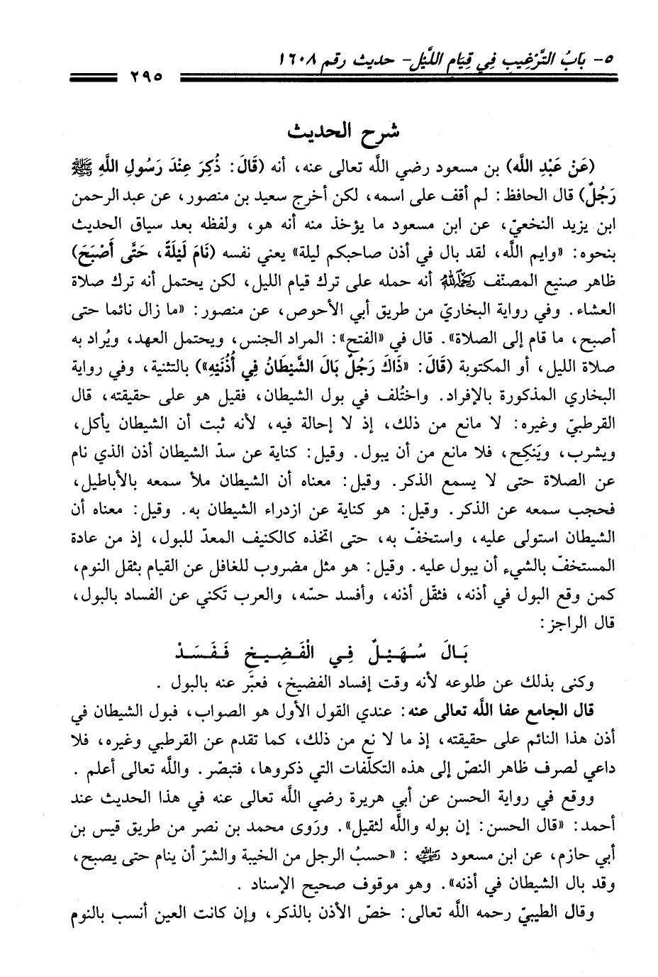 (عَنْ عَبدِ اللَّه) بن مسعود - رضي اللَّه تعالى عنه -، أنه (قَالَ: ذُكِرَ عِنْدَ رَسُولِ اللَّهِ - صلى اللَّه عليه وسلم - رَجُل) قال الحافظ: لم أقف على اسمه، لكن أخرج سعيد بن منصور، عن عبد الرحمن ابن يزيد النخعي، عن ابن مسعود ما يؤخذ منه أنه هو، ولفظه بعد سياق الحديث بنحوه: "وايم اللَّه، لقد بال في أذن صاحبكم ليلة" يعني نفسه (نَامَ لَيْلَةَ، حَتَّى أَصْبَحَ) ظاهر صنيع المصنّف -رَحِمَهُ اللَّهُ- أنه حمله على ترك قيام الليل، لكن يحتمل أنه ترك صلاة العشاء. وفي رواية البخاريّ من طريق أبي الأحوص، عن منصور: "ما زال نائما حتى أصبح، ما قام إلى الصلاة". قال في "الفتح": المراد الجنس، ويحتمل العهد، ويُراد به صلاة الليل، أو المكتوبة (قَالَ: "ذَاكَ رَجُلٌ بَالَ الشَّيْطَانُ فِي أُذُنَيهِ") بالتثنية، وفي رواية البخاري المذكورة بالإفراد. واختُلف في بول الشيطان، فقيل هو على حقيقته، قال القرطبيّ وغيره: لا مانع من ذلك، إذ لا إحالة فيه؛ لأنه ثبت أن الشيطان يأكل، ويشرب، ويَنكِح، فلا مانع من أن يبول. وقيل: كناية عن سدّ الشيطان أذن الذي نام عن الصلاة حتى لا يسمع الذكر. وقيل: معناه أن الشيطان ملأ سمعه بالأباطيل، فحجب سمعه عن الذكر. وقيل: هو كناية عن ازدراء الشيطان به. وقيل: معناه أن الشيطان استولى عليه، واستخفّ به، حتى اتخذه كالكنيف المعدّ للبول، إذ من عادة المستخفّ بالشيء أن يبول عليه. وقيل: هو مثل مضروب للغافل عن القيام بثقل النوم، كمن وقع البول في أذنه، فثقّل أذنه، وأفسد حسّه، والعرب تَكني عن الفساد بالبول، قال الراجز: