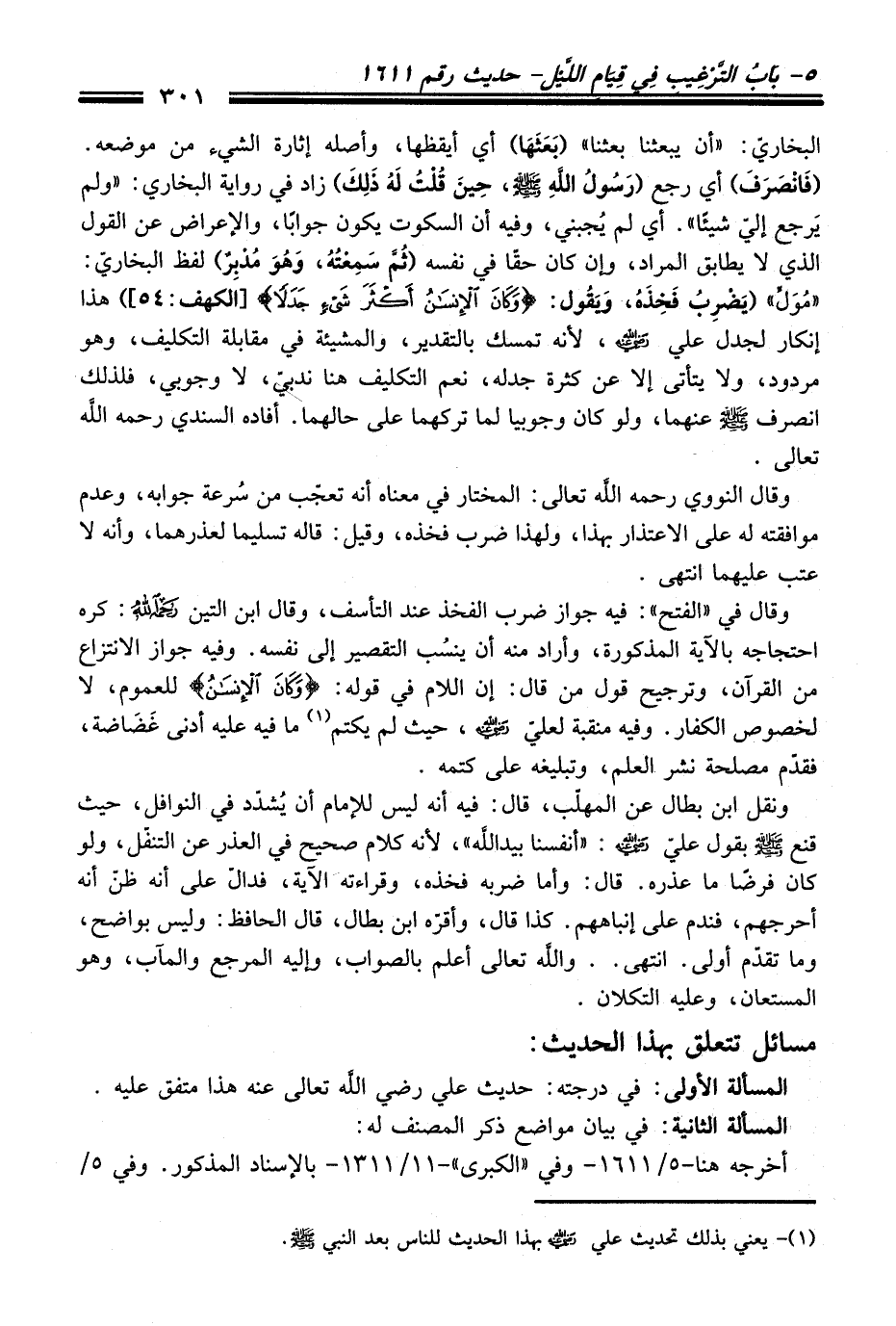 ونقل ابن بطال عن المهلب، قال: فيه أنه ليس للإمام أن يُشدّد في النوافل، حيث قنع - صلى اللَّه عليه وسلم - بقول عليّ - رضي اللَّه عنه -: "أنفسنا بيد اللَّه"، لأنه كلام صحيح في العذر عن التنقل، ولو كان فرضًا ما عذره. قال: وأما ضربه فخذه، وقراءته الآية، فدالّ على أنه ظنّ أنه أحرجهم، فندم على إنباههم. كذا قال، وأقرّه ابن بطال، قال الحافظ: وليس بواضح، وما تقدم أولى. انتهى .. واللَّه تعالى أعلم بالصواب، وإليه المرجع والمآب، وهو المستعان، وعليه التكلان.