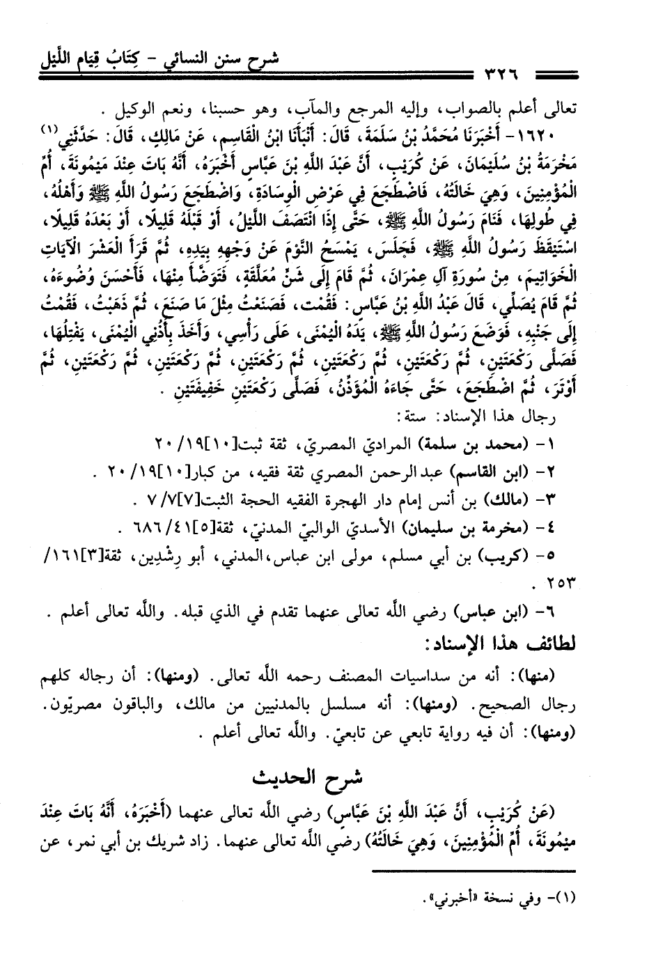1620 - أَخْبَرَنَا مُحَمَّدُ بْنُ سَلَمَةَ, قَالَ: أَنْبَأَنَا ابْنُ الْقَاسِمِ, عَنْ مَالِكٍ, قَالَ: حَدَّثَنِي (¬1) مَخْرَمَةُ بْنُ سُلَيْمَانَ, عَنْ كُرَيْبٍ, أَنَّ عَبْدَ اللَّهِ بْنَ عَبَّاسٍ أَخْبَرَهُ, أَنَّهُ بَاتَ عِنْدَ مَيْمُونَةَ, أُمِّ الْمُؤْمِنِينَ, وَهِيَ خَالَتُهُ, فَاضْطَجَعَ فِي عَرْضِ الْوِسَادَةِ, وَاضْطَجَعَ رَسُولُ اللَّهِ - صلى اللَّه عليه وسلم - وَأَهْلُهُ, فِي طُولِهَا, فَنَامَ رَسُولُ اللَّهِ - صلى اللَّه عليه وسلم - حَتَّى إِذَا انْتَصَفَ اللَّيْلُ, أَوْ قَبْلَهُ قَلِيلاً, أَوْ بَعْدَهُ قَلِيلاً, اسْتَيْقَظَ رَسُولُ اللَّهِ - صلى اللَّه عليه وسلم -, فَجَلَسَ, يَمْسَحُ النَّوْمَ عَنْ وَجْهِهِ بِيَدِهِ, ثُمَّ قَرَأَ الْعَشْرَ الآيَاتِ الْخَوَاتِيمَ, مِنْ سُورَةِ آلِ عِمْرَانَ, ثُمَّ قَامَ إِلَى شَنٍّ مُعَلَّقَةٍ, فَتَوَضَّأَ مِنْهَا, فَأَحْسَنَ وُضُوءَهُ, ثُمَّ قَامَ يُصَلِّي, قَالَ عَبْدُ اللَّهِ بْنُ عَبَّاسٍ: فَقُمْتُ, فَصَنَعْتُ مِثْلَ مَا صَنَعَ, ثُمَّ ذَهَبْتُ, فَقُمْتُ إِلَى جَنْبِهِ, فَوَضَعَ رَسُولُ اللَّهِ - صلى اللَّه عليه وسلم - يَدَهُ الْيُمْنَى, عَلَى رَأْسِي, وَأَخَذَ بِأُذُنِي الْيُمْنَى, يَفْتِلُهَا, فَصَلَّى رَكْعَتَيْنِ, ثُمَّ رَكْعَتَيْنِ, ثُمَّ رَكْعَتَيْنِ, ثُمَّ رَكْعَتَيْنِ, ثُمَّ رَكْعَتَيْنِ, ثُمَّ رَكْعَتَيْنِ, ثُمَّ أَوْتَرَ, ثُمَّ اضْطَجَعَ, حَتَّى جَاءَهُ الْمُؤَذِّنُ, فَصَلَّى رَكْعَتَيْنِ خَفِيفَتَيْنِ.