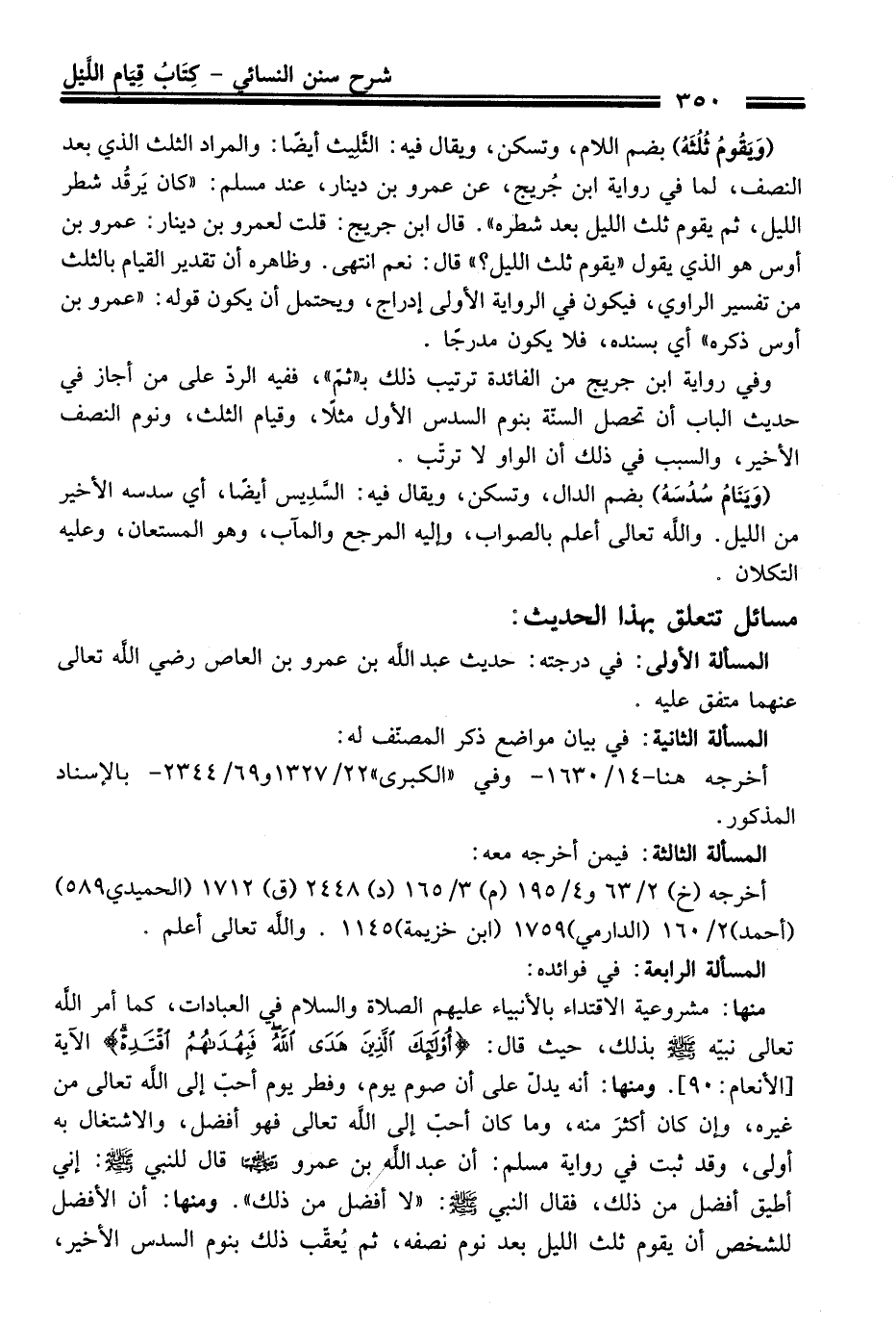 وفي رواية ابن جريج من الفائدة ترتيب ذلك بـ "ثمّ"، ففيه الرد على من أجاز في حديث الباب أن تحصل السنّة بنوم السدس الأول مثلاً، وقيام الثلث، ونوم النصف الأخير، والسبب في ذلك أن الواو لا ترتّب.