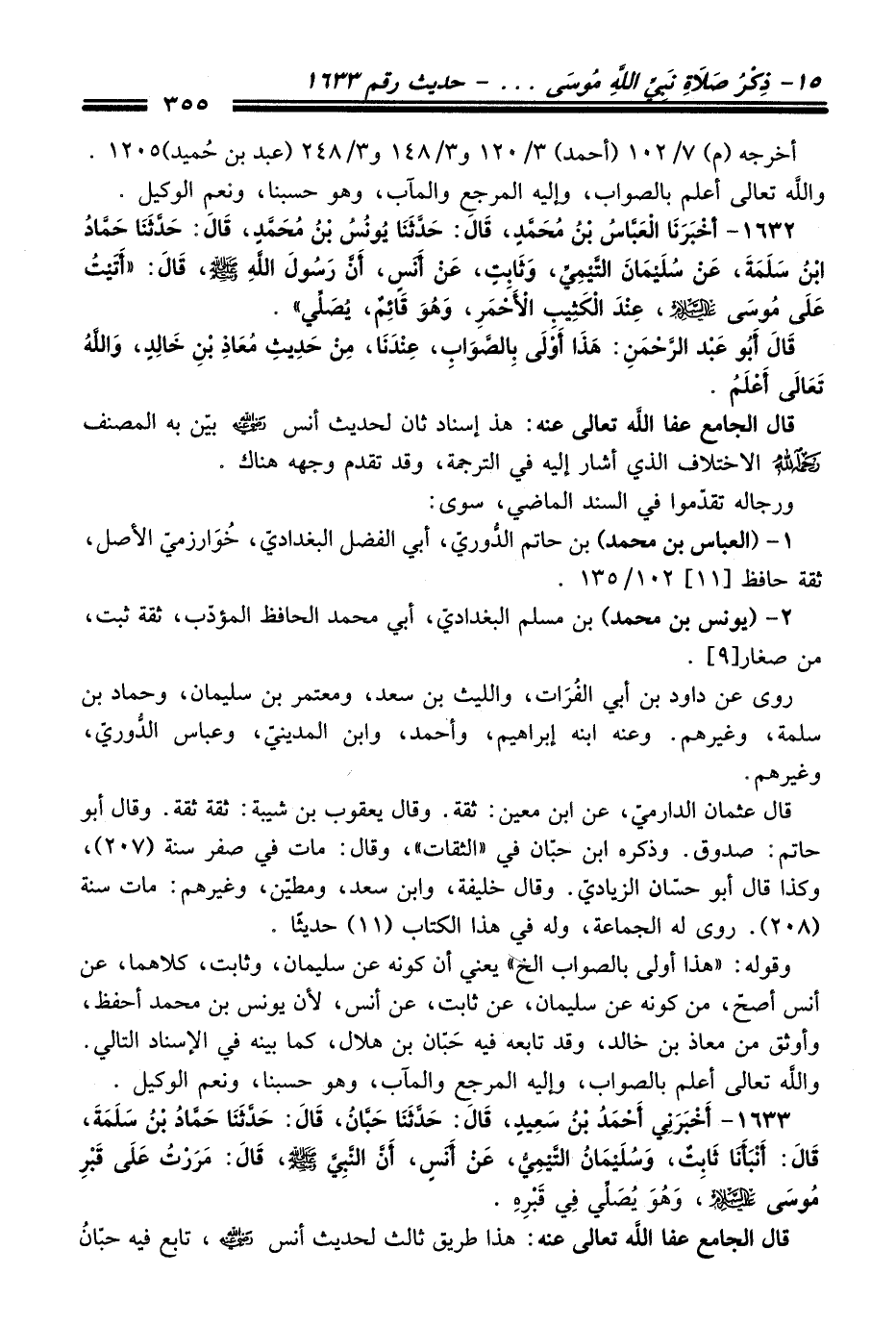 1633 - أَخْبَرَنِي أَحْمَدُ بْنُ سَعِيدٍ, قَالَ: حَدَّثَنَا حَبَّانُ, قَالَ: حَدَّثَنَا حَمَّادُ بْنُ سَلَمَةَ, قَالَ: أَنْبَأَنَا ثَابِتٌ, وَسُلَيْمَانُ التَّيْمِيُّ, عَنْ أَنَسٍ, أَنَّ النَّبِيَّ - صلى اللَّه عليه وسلم -, قَالَ: «مَرَرْتُ عَلَى قَبْرِ مُوسَى - عَلَيْهِ السَّلاَمُ -, وَهُوَ يُصَلِّي فِي قَبْرِهِ».
