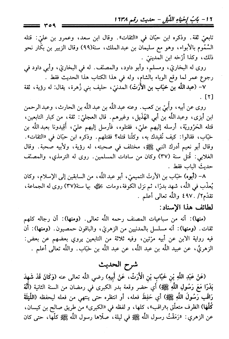 (عَنْ عَبْدِ اللَّه بْن خَباب بْنِ الأَرَت، عَنْ أَبِيهِ) - رضي اللَّه تعالى عنه - (وَكَانَ قَدْ شَهِدَ بَدرا مَعَ رَسُولِ اللَّهِ - صلى اللَّه عليه وسلم -) أَي حضر وقعة بدر الكبرى في رمضان من السنة الثانية (أَنَّهُ رَاقَب رَسُولَ اللَّهِ - صلى اللَّه عليه وسلم -) أي حَفِظَ فعله، أو انتظره حتى ينتهي من فعله ليحفظه (اللَّيْلَةَ كُلَّهَا) الظرف متعلّق بـ "راقب"، كلها، ولفظه في "الكبرى" من طريق صالح بن كيسان، عن الزهري: "رَمَقْتُ رسول اللَّه - صلى اللَّه عليه وسلم - في ليلة، صلاّها رسول اللَّه - صلى اللَّه عليه وسلم - كلّها، حتى كان