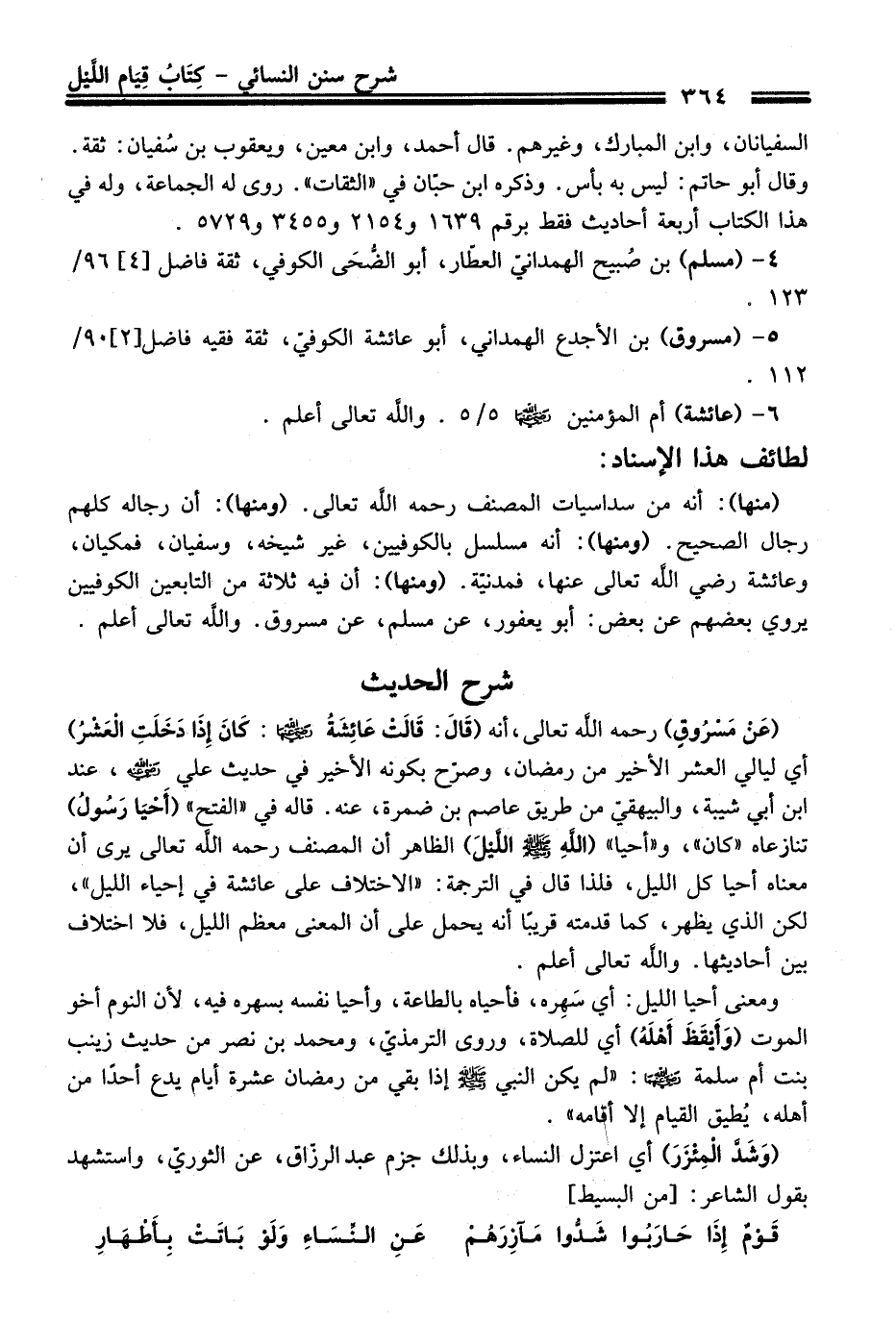 (عَنْ مَسْرُوقٍ) -رحمه اللَّه تعالى-، أنه (قَالَ: قَالَتْ: عَائِشَةُ - رضي اللَّه عنها -: كَانَ إِذَا دَخَلَتِ الْعَشْرُ) أي ليالي العشر الأخير من رمضان، وصرّح بكونه الأخير في حديث علي - رضي اللَّه عنه -، عند ابن أبي شيبة، والبيهقيّ من طريق عاصم بن ضمرة، عنه. قاله في "الفتح" (أَحْيَا رَسُولُ) تنازعاه "كان"، و "أحيا" (اللَّهِ - صلى اللَّه عليه وسلم - اللَّيْلَ) الظاهر أن المصنف -رحمه اللَّه تعالى- يرى أن معناه أحيا كل الليل، فلذا قال في الترجمة: "الاختلاف على عائشة في إحياء الليل"، لكن الذي يظهر، كما قدمته قريبًا أنه يحمل على أن المعنى معظم الليل، فلا اختلاف بين أحاديثها - واللَّه تعالى أعلم.
