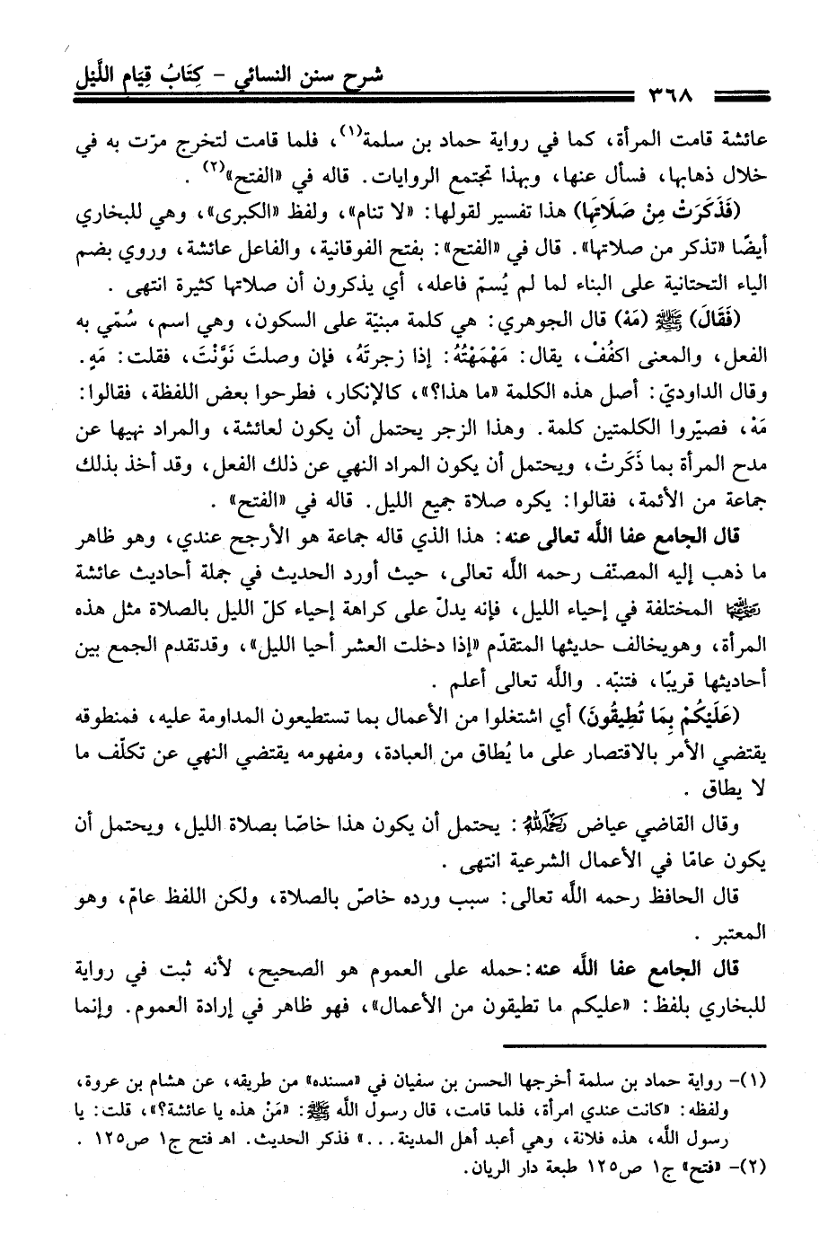 (¬1) - رواية حماد بن سلمة أخرجها الحسن بن سفيان في "مسنده" من طريقه، عن هشام بن عروة، ولفظه: "كانت عندي امرأة، فلما قامت، قال رسول اللَّه - صلى اللَّه عليه وسلم -: "مَنْ هذه يا عائشة؟ "، قلت: يا رسول اللَّه، هذه فلانة، وهي أعبد أهل المدينة ... " فذكر الحديث. اهـ فتح ج 1 ص 125.